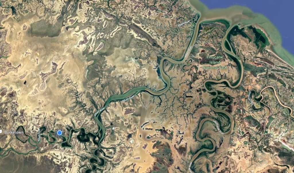 The blue dot is our current camp for tonight, on the salt flats of the Albert River just north of Burketown.