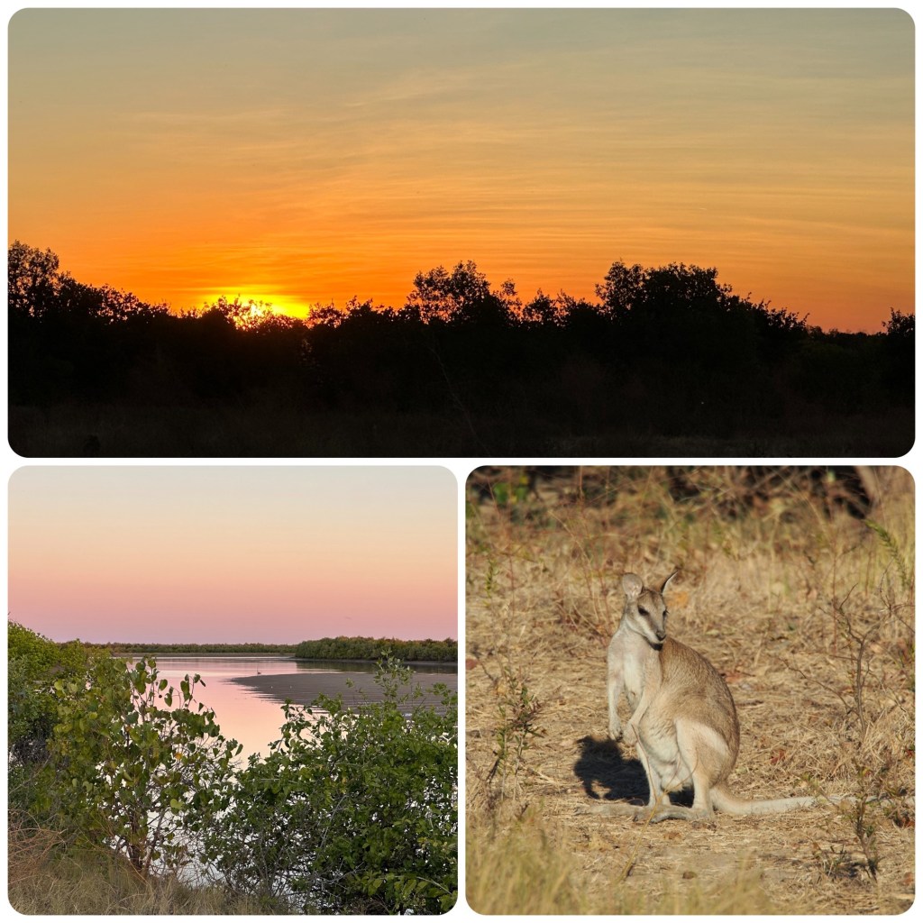 We spend the days here cleaning some of the red dust off the van and vehicle, out of storage bins and off clothes. Riding and swimming at the pool, chatting to neighbours and just relaxing. Neighbours across the road twice delivered fresh fish to us. It was delicious. We made several trips up the road to purchase mud crabs which are delicious and prawns. Each day finishes with a gorgeous sunset. We will sad to move on tomorrow.