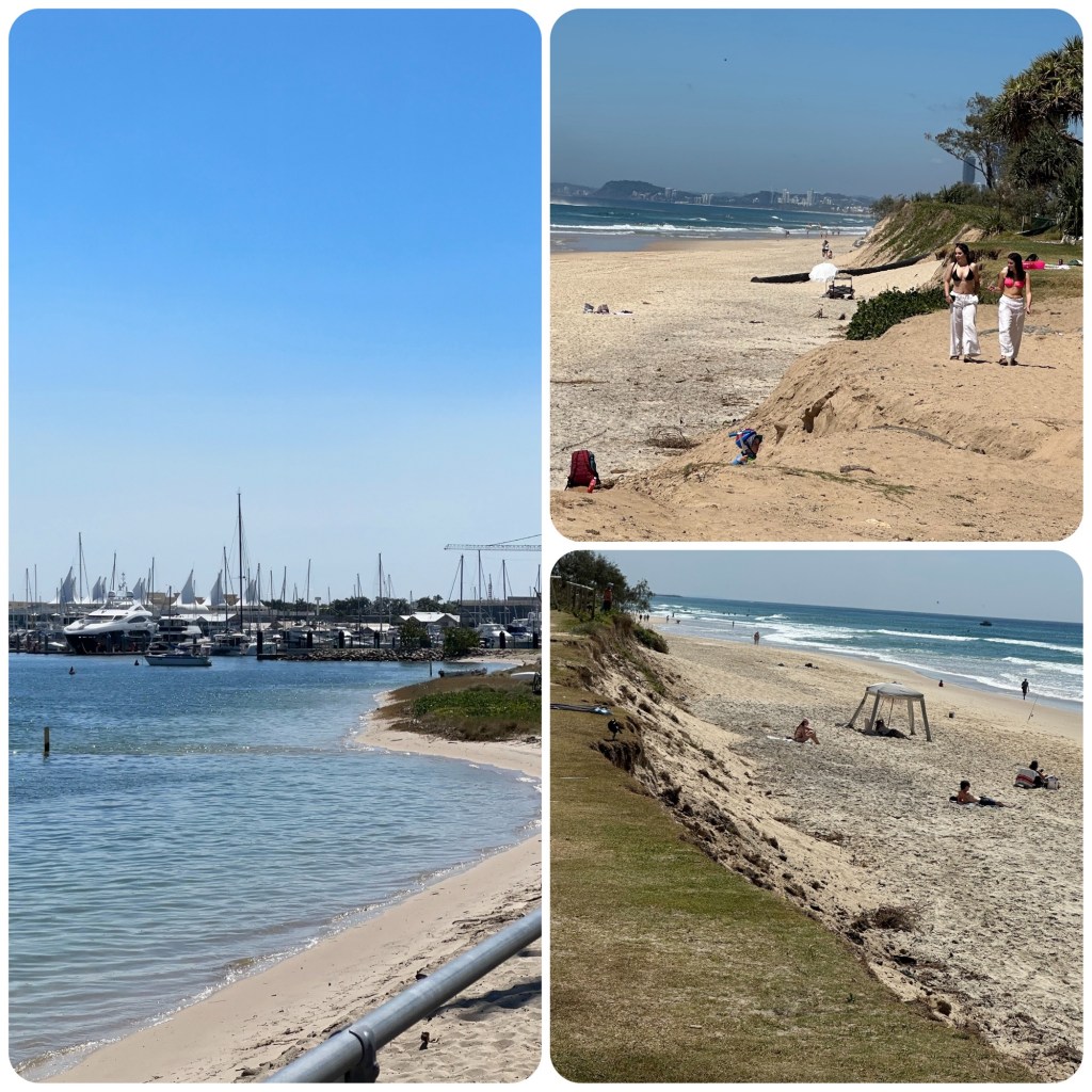Monday after a relaxing morning we headed off for a bike ride through the Broadwater parklands over the bridge and out toward Broadwater Beach. It’s amazing to see the beach and how much sand has disappeared due to the latest cyclone. There is lots of building happening and sand dredging to move sand onto the beach. It’s going to take a long time to get the beach back to what is was. Then we cycle out to the Spit, passed what used to be some very swanky resorts but are starting to look very tired. There is again a lot of work happening around the parklands at the end of the spit with new car parks and pathways, jetty’s and gardens. We sit and watch the boats entering and exiting the mouth of the river for a while just soaking in the sun before riding back along the pathway to find somewhere for lunch. Found Pete’s Seafoods, a fish shop and processing factory. Boy were their fish and chips yummy. Nothing better than a feed of fish and chips sitting outside enjoying some people watching. (P:- especially when we can select a fresh fish fillet and have it cooked to our liking). Then it’s the return cycle back to the van. 22 km cycled all up. Not too bad for an old girl (P:- an old girl and her E-Bike).
