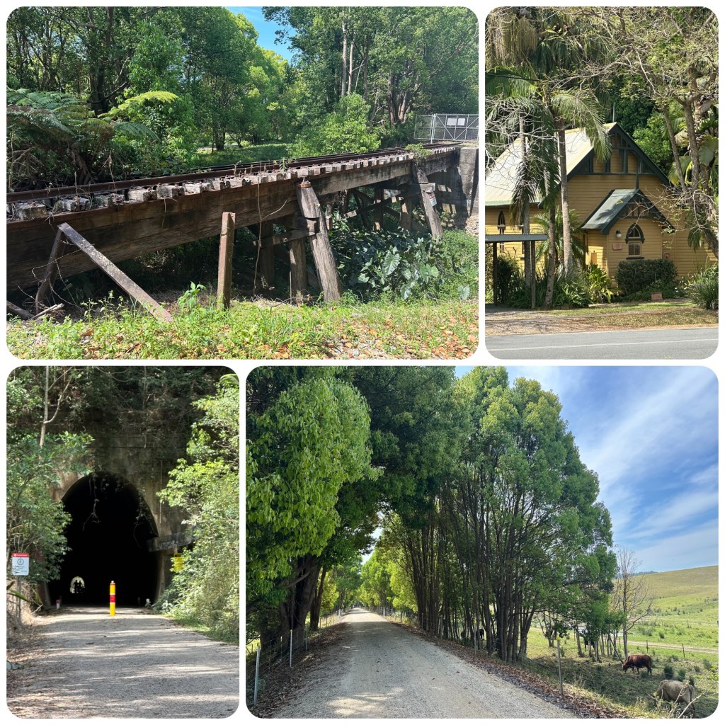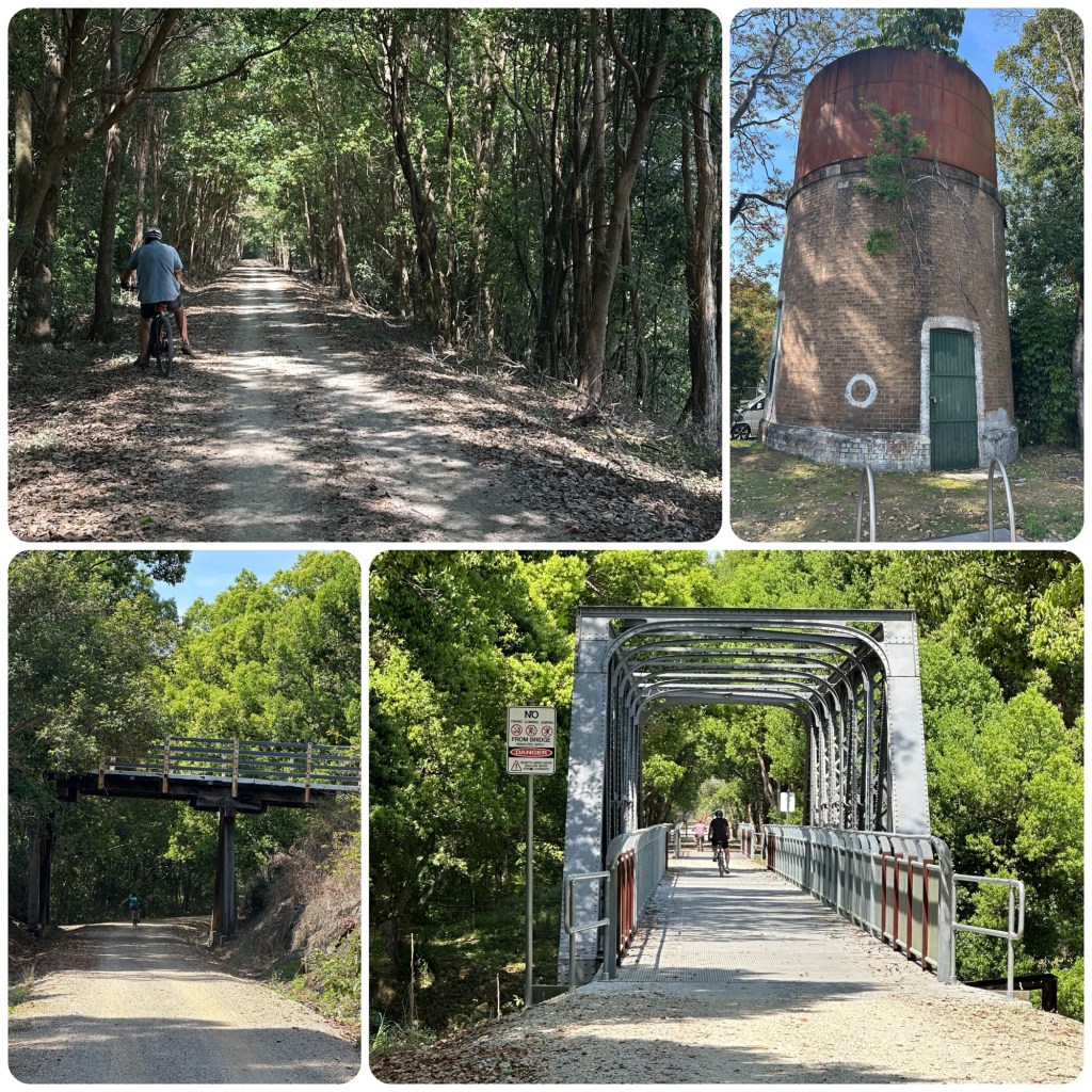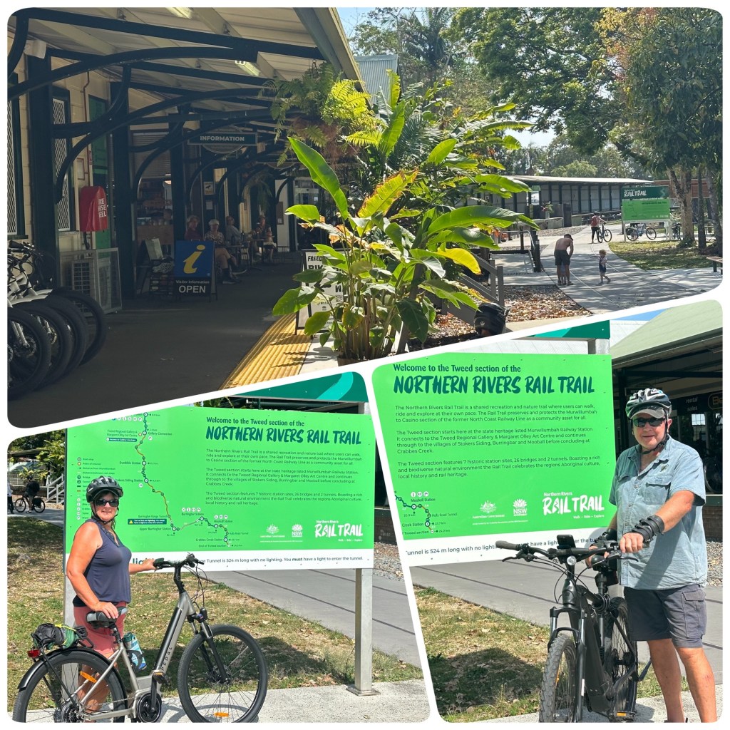 We make it a whole 80 kilometres before we stop in Murwillumbah, out come the bikes and we hit the Northern Rivers Rail Trail. Now let me back up just a bit. Yes, I have a new e-bike and yes I could get ahead of Philip and do it without stress on my knees. I liked the feeling, but apparently Philip didn’t like being left behind. You all know that he is a keen bargainer, so he’s busily searching Facebook Marketplace for a used e-bike. Luckily for him, unluckily for me, (I liked outriding him,) he found one the right size and price, that had hardly been used. Now we have four bikes on board. Two that will get very little use and two new snazzy e-bikes. (P:-What can I say? But one thing for sure is I do like to buy a bargain – and I did – and the Author still sails past with a cheeky grin).