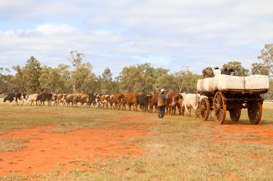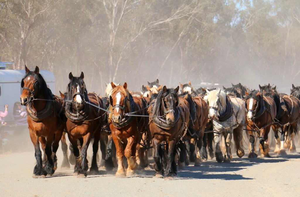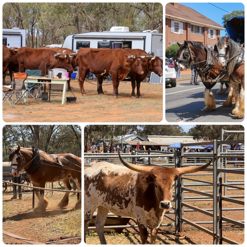 Friday dawns chilly but clear and we are ready to see what this show has to offer. First stop is to watch a lady talking about riding side saddle, very interesting and very etiquette based, from clothing to saddlery to mounting the horse. Then we wander around the stalls selling all things horsey, stock whips, saddlery, garden art etc. At 10.30 we walk the short distance into town for the Grand Parade. The highway is closed off and the horses, camels, mules and oxen make their way down the Main Street towing carriages, carts and wagons, along with cattlemen and women on horseback. A wonderful display of times gone by. (P:-This is the second time I have been to this festival -one not to be missed if you like “Rural History”. I can only just remember “Beauty and Topsy” the last two draught Horses on our South Road Family Farm. This festival is loaded with dedicated friendly historians who just love to show their animals and share their knowledge. Old horse drawn implements demonstrated, Drays, Traps and Carriages, Wool Wagons, Paddock Rollers to Cobb and Co Coaches were all there being demonstrated. A hi-light of the festival was the Grand Parade of all of the above down the Main Street of Barellan. The traffic stopped, the Road trains waited ( the main st is also the Highway thru the area) as the four legged spectacle took ownership of the main street. The sight and sounds of 28 Bullocks pulling a wagon and 32 Draught Horses pulling another followed by the Cobb and Co Coach harnessed to beautiful heavy horses will leave a lasting memory! A highlight of the festival was the harnessing of 62 Heavy Horses to a loaded wool wagon all controlled from the wagon ( that’s a long set of reigns to the lead 4 horses) Evidently 62 Horses harnessed and used is a world record!)