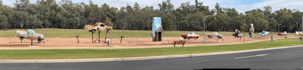 A short stop in Condobolin to view the “Utes in the Paddock”, a very quirky tourist stop. Local residents nominated members of Condobolins youth services to represent their artwork and culture in this quirky exhibition. (P:- A line up of Holden Utes that people have let their Imagination run loose on- if ya are gunna have art well this type of art is for me! I have seen a few similar installations in our travels – the “Cadillac Car” row in Texas and the “John Deere” tractor row in Kentucky.