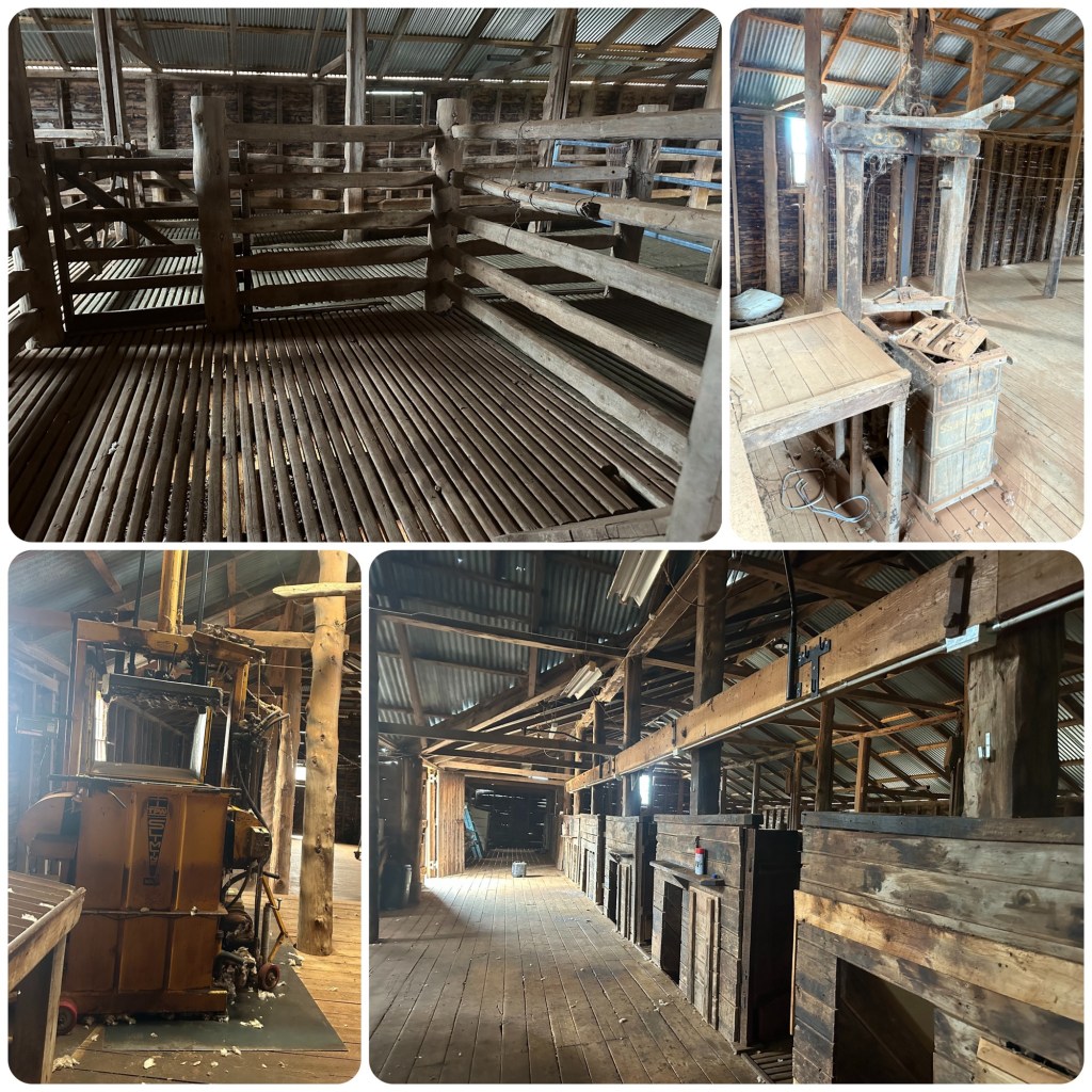 Along the way Philip spots a large old timber Woolshed off in the distance. We pullover and park and he gets out to take some photos from the fence line/gateway. Then just as he is about to get back into the truck a guy in a Ute with his kelpie on the front seat pulls up and asks what he’s doing. Philip explains the we love old Woolsheds and he was just taking some photos. The guy told him to drive in and have a good look. “The rear door is unlocked, feel free to have a look inside and enjoy”. We find out that this is the Naradhan Woolshed on Morwell Station and although it is not used anymore it has been kept in great condition. What a treat to be able to wander around. The smell or sheep and lanolin still clings to the timber and if we stand still we can almost hear the sheep, the Shearers and the rouse abouts echoing through the stalls. This has been a highlight for this part of our trip. (P:- Naradhan Wool Shed built Circa 1888 and is in beautiful condition, originally a 30 stand hand shear shed ( Imagine the “Click Goes the Shears” sound! When shearing was mechanised it was converted to a 14 stand shed, (all the old chutes and pens from the original days are still all in place) machines driven by an overhead belt system, originally by steam engine then later a Stationary gas engine. 4 generations of wool presses still onsite along with a fantastic amount of old shearing equipment still in the shed ( some in place, some stored, which tells the story of the evolution of shearing Merino sheep in Australia. How kind of the owner to allow us to explore!