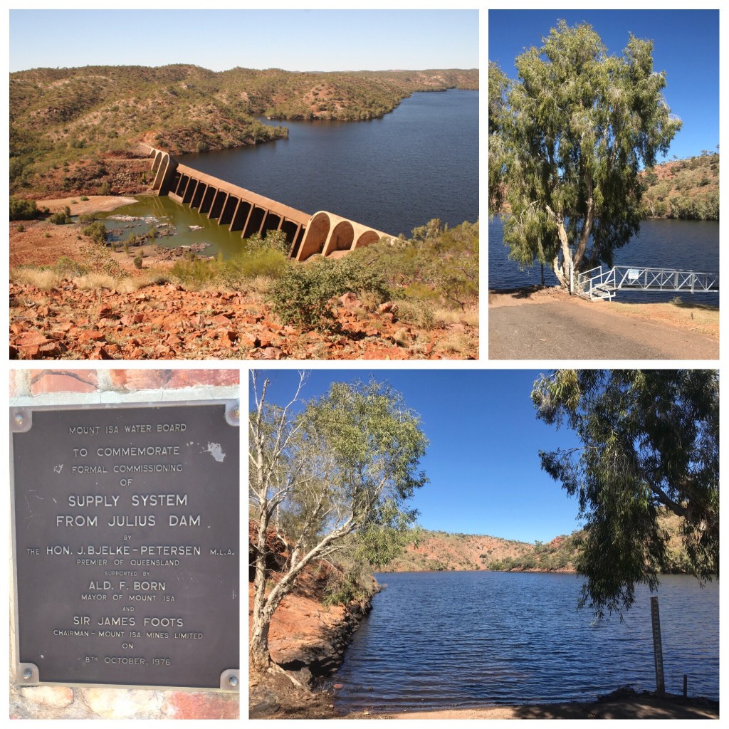 Today we left Mt. Isa to make our way to Karumba by Saturday. Turning east out of Mt Isa we stay on the main road for about 20 kilometres and then we turn left onto the Lake Julius Road, obviously heading to Lake Julius. One of Mt Isa’s Water storage’s. As we turn onto this road it turns to gravel and we cross our first cattle grid, the first of 12 today. Then we start the creek/river crossings, all dry. It’s 74 kilometres to Lake Julius and we had 54 creek crossings, some small and some quite wide. Lots of ups and downs. We meander our way into Lake Julius, crossing the Leichhardt River, 150 metres wide, and up to the lookout over the dam wall. It’s a funny little lookout with two homes there and the path to the lookout going round the side of the houses and along the front, past their washing line which was tied to the fence to stop it spinning round, and across to the lookout. This dam was opened in 1976 by the Honorable Joe Bjelke-Peterson and dams the tributaries of the East Leichhardt River. It’s a beautiful spot, but unfortunately only a day use area. We stopped for lunch here and enjoyed the quiet and solitude with great views of the lake.