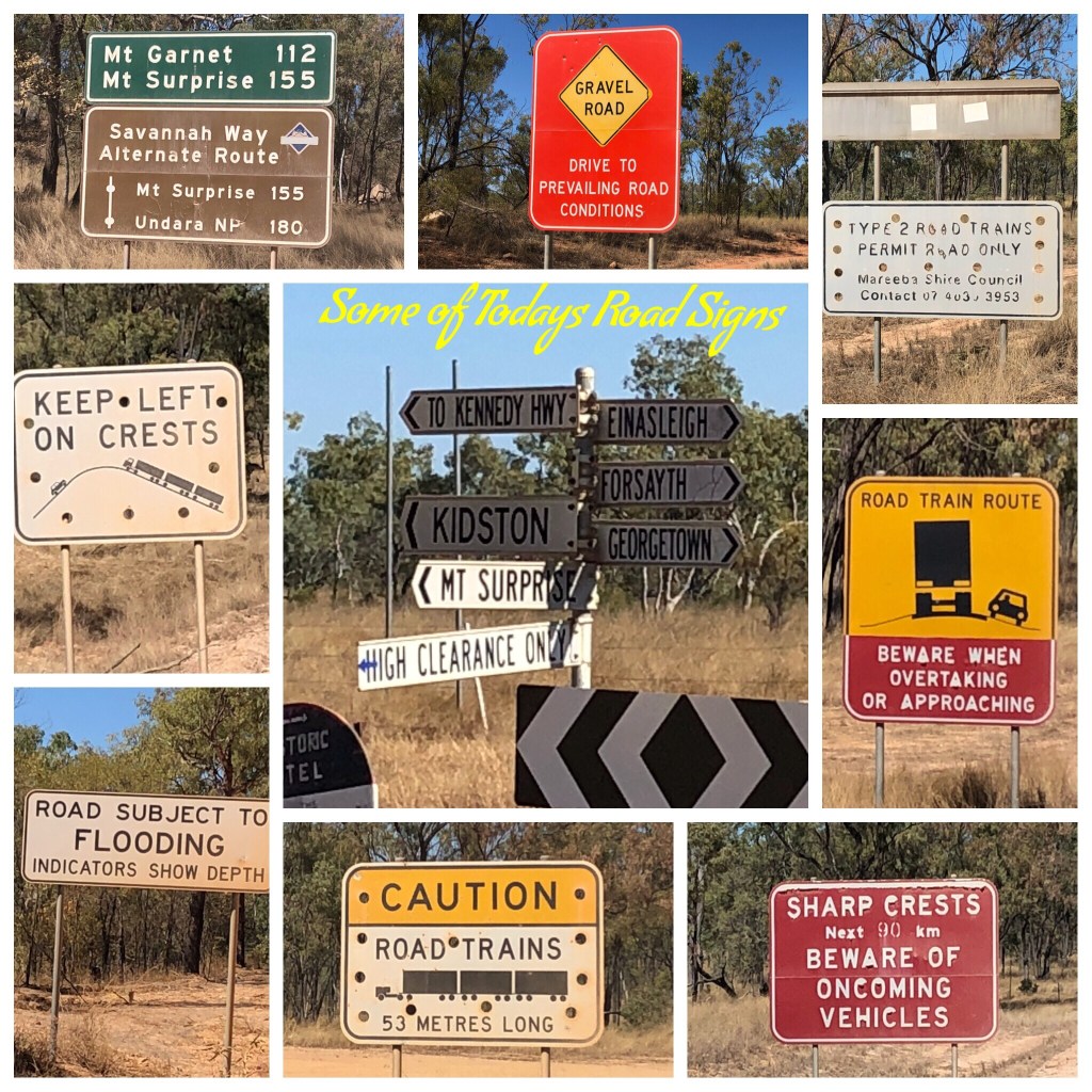 Unfortunately the time comes when you have to make the decision to start to head south. Today is that day. Although there is a lot more we would like to see up this end of Australia, time limits us. So today we leave Chillagoe and head toward Mt Surprise down the Ootan Track, then down towards Einasleigh and Copperfield Gorge. Once we leave the main road, within the first few kilometres there are a series of road signs and then they continue sporadically as we continue down the road. To some travellers they would be quite off putting but the road is good and we have a good radio for communication with other travellers and truck drivers. It’s quite a pretty area with numerous (P- Understatement!!!) dry creek crossings and many changes of vegetation along the way. Quite a bit of this road follows the Savanahlander rail line from Almaden to Forsayth, crossing the track in several spots.