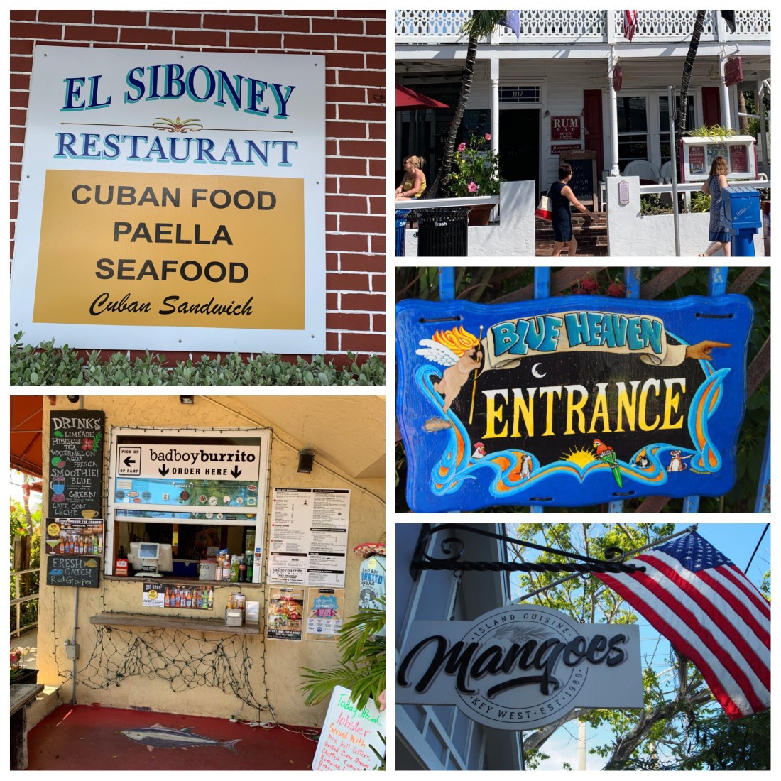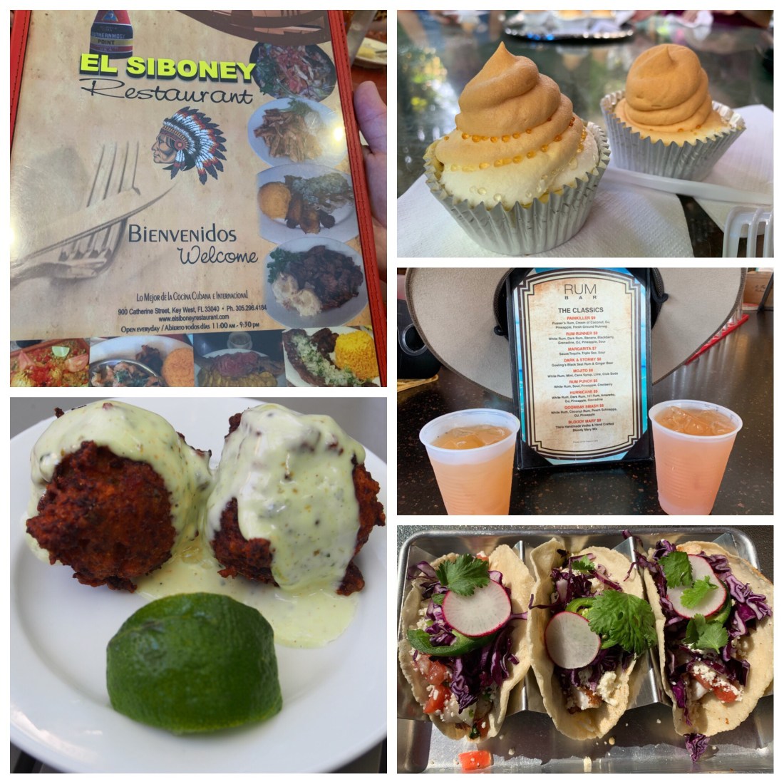 After this we walked to our next destination with Shannon showing us points of interest along the way. Tasting number two was at Bad Boys Burritos, where we enjoyed a fish taco with Red Grouper, tomato, cabbage, crumbled cheese and peppers in a soft taco. Again this was delicious and in a very relaxed setting. Everything was so fresh here. They have no freezers and no microwaves, everything is prepared fresh and replaced every 48 hours. Next stop was the Rum Factory for a rum cocktail. As Philip drank my coffee I suggested I should drink his cocktail but unfortunately that didn’t happen. While finishing our cocktails we wandered along the streets past some quaint old homes and a grocery store, to the highest point on the island. Got to work off those calories. It was a big climb all 14 feet. There is now a lighthouse here that was moved from the outer reef after a storm damaged it. It now marks this high point and can be climbed for great 360 degree views of the area. After this stop we head to Blue Heaven Restaurant where Ernst Hemingway and his wife once resided. At this stop we got to taste the famous Key Lime Pie. Delicious and enjoyable in another great setting. Our last stop was just around the corner in Duval Street at Mangoes. Here we tasted conch fritters. Conch has a texture a bit like abalone and was very tasty served with a key lime aioli dressing. So now after three hours of great food tasting, local history and information and a nice bunch of people we have finished the tour and look forward to receiving some recipes which will be sent to us soon. I’m sure cooking these things at home will not be near as nice as tasting them here in Key West.