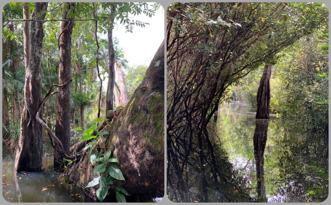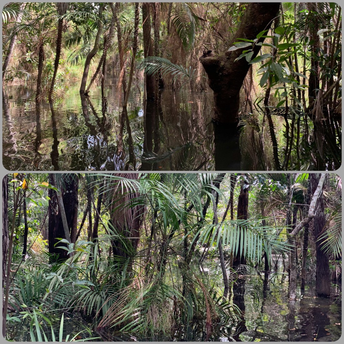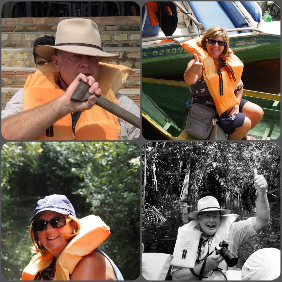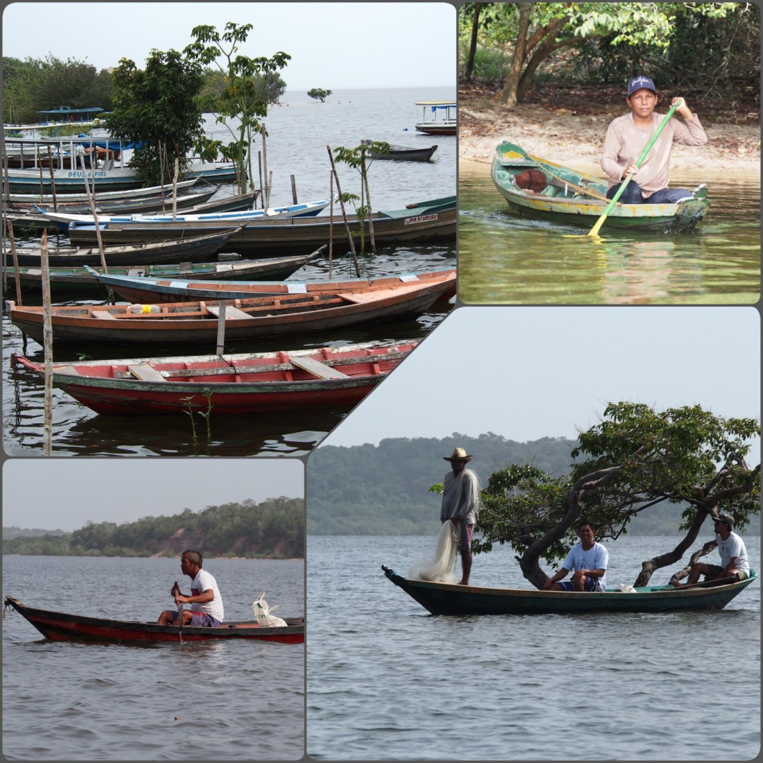 P:- After a casual breakfast (and my morning gym session (dream on!) we casually wander down to the tender for our trip ashore. We had nothing planned apart from a casual walk around the town of Alter Do Chao (approx 6500 residents), a town that claims the only true white sand beaches on the Amazon. As we take approx 20 steps ashore we are approached by a guy with a small motor boat offering a “Forest, boat, canoe”. In my best Brazilian Portuguese I negotiated a trip in an old crusty boat with a “Smokey” 2 stroke motor to somewhere! We assumed the 1 1/2 fingers he put in the air wasn’t a rude gesture but meant it would be 1 1/2 hours for 75 Reais each (25 bux). So off we motor (no mosquitoes today due to 2 stroke exhaust fumes) round the corner and past the beach shelters somewhat submerged by high water (sorry to the many people looking forward to a beach day) past the town centre and into the most beautiful tributary of the Rio Tapajos motoring amongst forest, what in the dry would be green lush flood plains, past villages, birds, flowers, canoes, old river boats etc. We were quite satisfied with our little “cruise to somewhere”. The “captain” brings us to a landing with a few canoes there, circles around and heads back to town. In my, by now very good Brazilian sign language I imitate me paddling a canoe and after a stern look from us he about turns and takes us to the canoe dock where we are allocated an old canoe with 2” of water in the bottom and a guide / paddler. Once we delicately step aboard (with a couple from Belgium) it’s off we go! Maybe slightly overloaded (me) we had no more than 2” free board which created a few nerve racking moments when the water almost lapped the top of the vessel on several occasions.