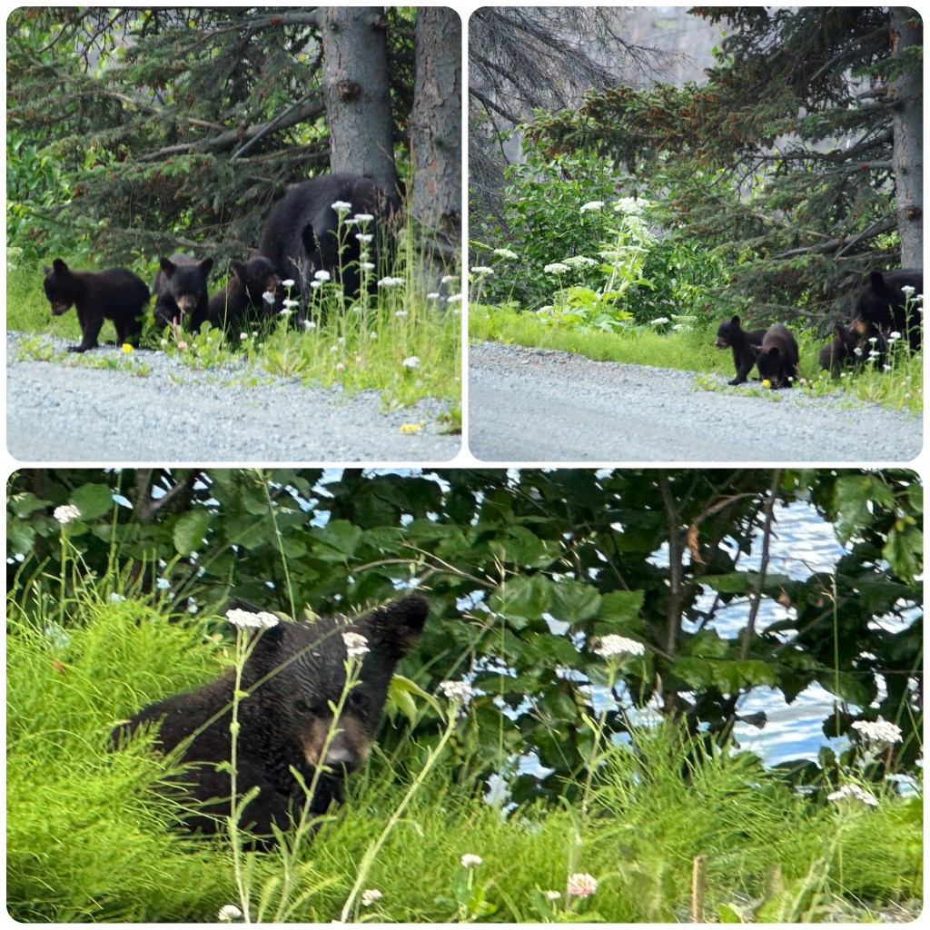 Back on the road and we spot a black bear just off to the side, then further on a rare sighting of a Lynx. We turn into Upper Skilak Lake Campground to check it out for tonight and spot a sow with 3 cubs playing on the verge beside the lake. This time we got pics. The cubs were so cute. As it is only just midday we continue into Soldotna passing many outfitters, river rafting guides, white water rafting guides and fishing guides. This area of the Kenai River is a renowned Salmon fishing area and when the salmon are running is packed with fisherman. In Soldontna we grab a few groceries and then head back to the campground to set up for the night.