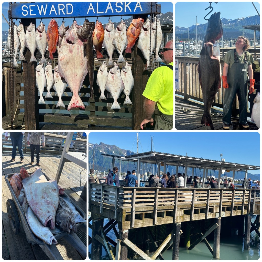 The waterway from the marina along Resurrection bay has a continual stream of boats. In the morning they are all heading out for fishing or touring. Some returning around lunchtime before heading out a short time later with a fresh batch of fishermen or tourists and returning late afternoon. As there is 20 hours of daylight the boating starts early and finishes late. We walked up to the fish dock late afternoon as the boats were returning to see what catches they got. The largest Halibut we saw was 179 lb, (81kg). Lots of smaller halibut, yellow eye cod, salmon and various other varieties. We watched a couple of professional fishermen cleaning their catch at the cleaning station. Wow do they know how to fillet fish expertly.
