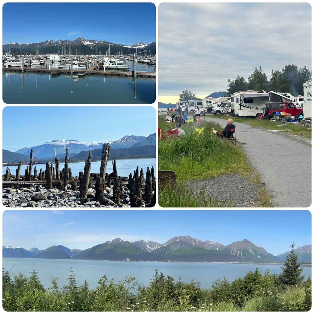 This quaint little town is nestled on the banks of Resurrection Bay and is the gateway to the Kenai Fjords National Park. The Rv park we are in has approximately 1000 sites spread along the shores of the bay. We were not expecting to have a waterfront site but are thrilled when we eventually find site 489, right on the waterfront. The walking track separates us from the shoreline and fire pits situated along the edge, shared between 3-4 campsites. Great spot. Plenty of walking to be done here with town one way and the marina, tour area (P – and the fresh from trawler seafood!) the other and plenty of people watching to do.