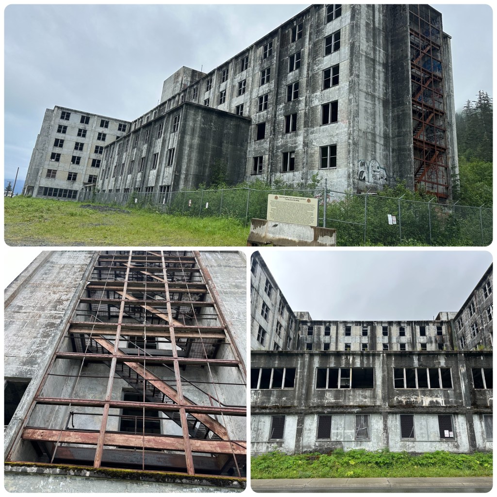 Whittier was an Army Garrison and at the end of WW11 people were still wintering in small wood framed buildings. With the advent of the Cold War it was deemed necessary to build a more substantial building that would house 1000 troops under one roof. The building was designated the Buckner Building and was destined to become the largest building in Alaska. Construction began in 1949 and was ready for occupancy in 1954. The building was a city under one roof. In addition to housing the troops it also had a 350 seat theatre, hospital, 4 lane bowling alley, bakery, church, barber shop, library, radio and tv station and a huge cafeteria. It was all connected with wide stairwells and elevators. This massive building was in 7 sections, each separated by 8 inch gaps. This design gave the building flexibility and when the 1964, 9.2 Alaskan Earthquake hit the building survived when most of the other structures around the town crumpled. The military mothballed the building in 1960 when the Whittier Army Port was closed.