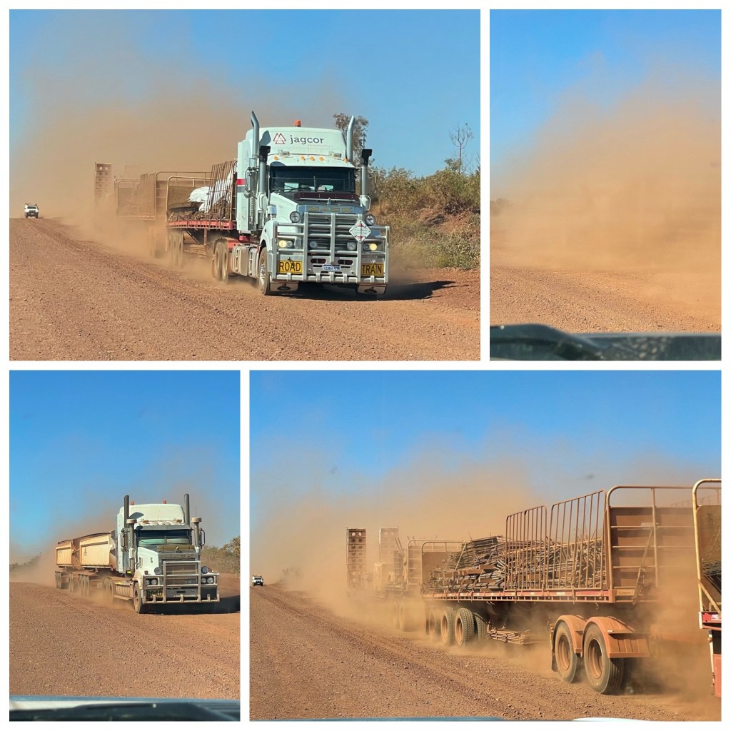 The “Truckies” are most polite and excellent to travel with, they will call us (on the radio) to overtake when they deem it safe and will have a short discussion at times also. At 60m long, up to 210 tonne with 98 wheels and travelling at 80-90 kph they are quite a length to overtake!