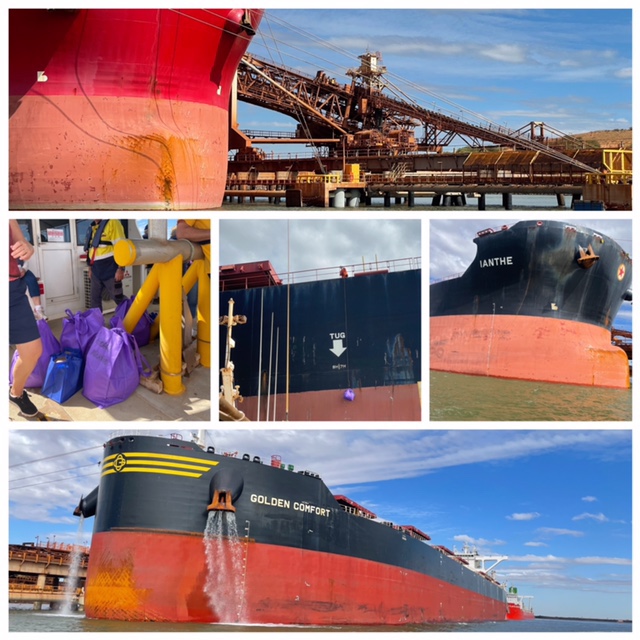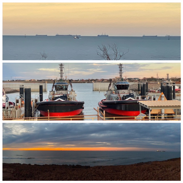 During our stay here we have done two tours. The first one organised by the Seafarers Mission. After a very informative audio visual presentation we hopped on a bus down to the harbour for a cruise on a workman’s launch around the harbour. This certainly made us see just how large the ships are and how small an area they have to spin the ships 360 degrees to get them heading back out to sea before they are pushed into their berth by 6 tugs. As we were touring past the ships we were also doing a grocery/gift delivery of pre-ordered items to some of the international crew. The orders are sent to the Seafarers mission who purchase the items, pack them individually, then deliver to the ships. The launch noses up the the side of the ship where a masked crewman lowers a rope which is attached to the bag of goods and then its hoisted up and over the railing. Items are delivered this way as COVID has stopped crew members from leaving their ship (some have been onboard for over 18 months!. We motor past all the ships currently berthed in the harbour. 19 ships can be berthed at one time with another two berths being built in the near further. All ships are bought in and turned to face back out to sea before being berthed.