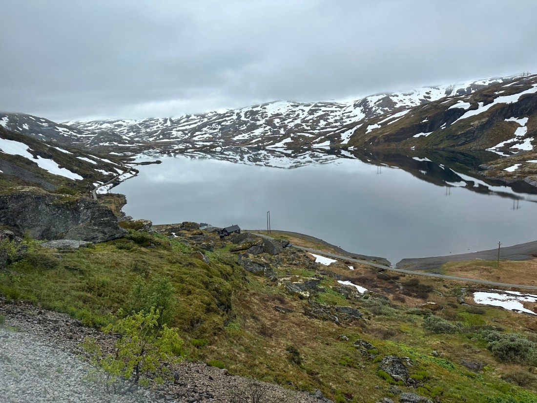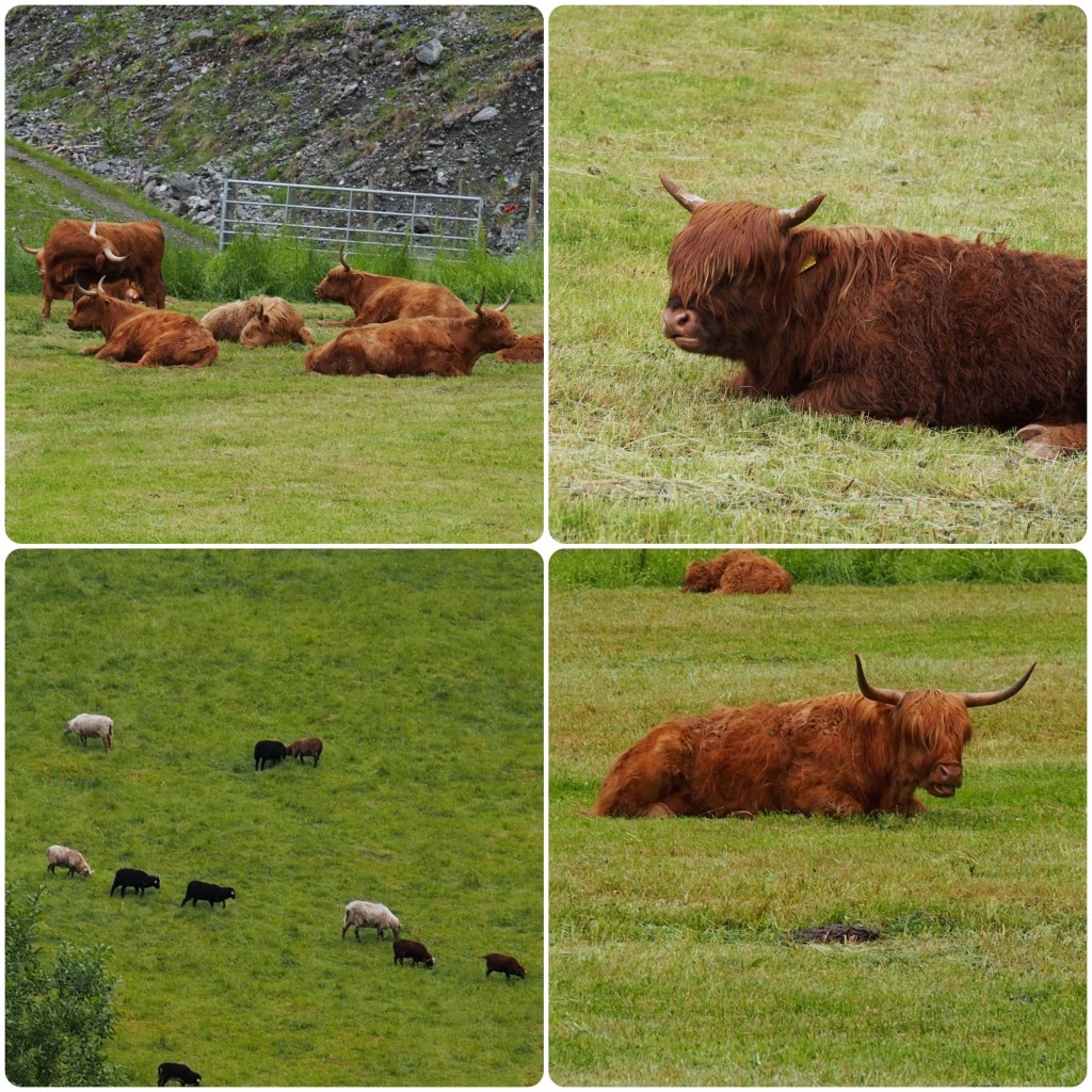 The scenery is lovely (P:- Awesome is a betterer word) with mountains, plateaus, creeks, waterfalls and quaint little villages along the sides of the fjords. Reindeer roam the hills here and are right near the roadside giving us great views of them and their cute calves.
