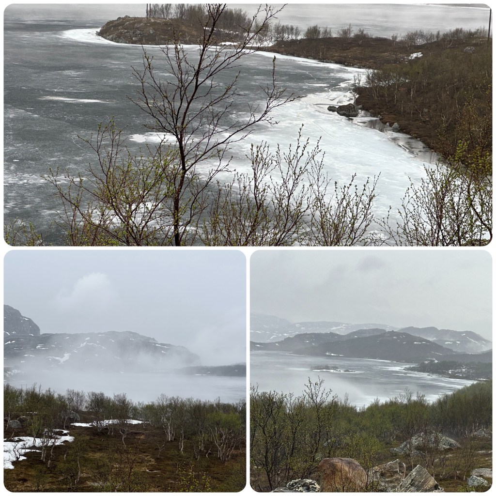 Only one of us was game enough to brave the water and it wasn’t Helen, Philip or I. Besides it was raining and quite cool. Seat heaters worked a trick to warm the body after what Ian said was a “very nice swim”. The road out to this point was quite diverse passing through the outskirts of town and winding over the hills still patchy with snow, past numerous lakes and rivers. The further we went the more ice was on the lakes and as we discovered later it was thick enough that when a fist sized rock was thrown onto it (by the “boys” in our group) the rock just skidded along the top. Along the way we spotted reindeer and a moose. Returning to the Hotel we are hopeful that our luggage may be there but our hopes were dashed when we checked and it was still sitting in Oslo, one step closer than Iceland. After speaking to the Airports staff they think it MAY turn up tomorrow morning, if not it will be the next day. Philip and Ian return our rental car to the drop off point near the Hurtigruten terminal (P:-Hertz instructions were leave the Volvo in the public’s car park unlocked with keys in drivers door pocket they will collect later). and walk back to the hotel, then it’s dinner and an early night.