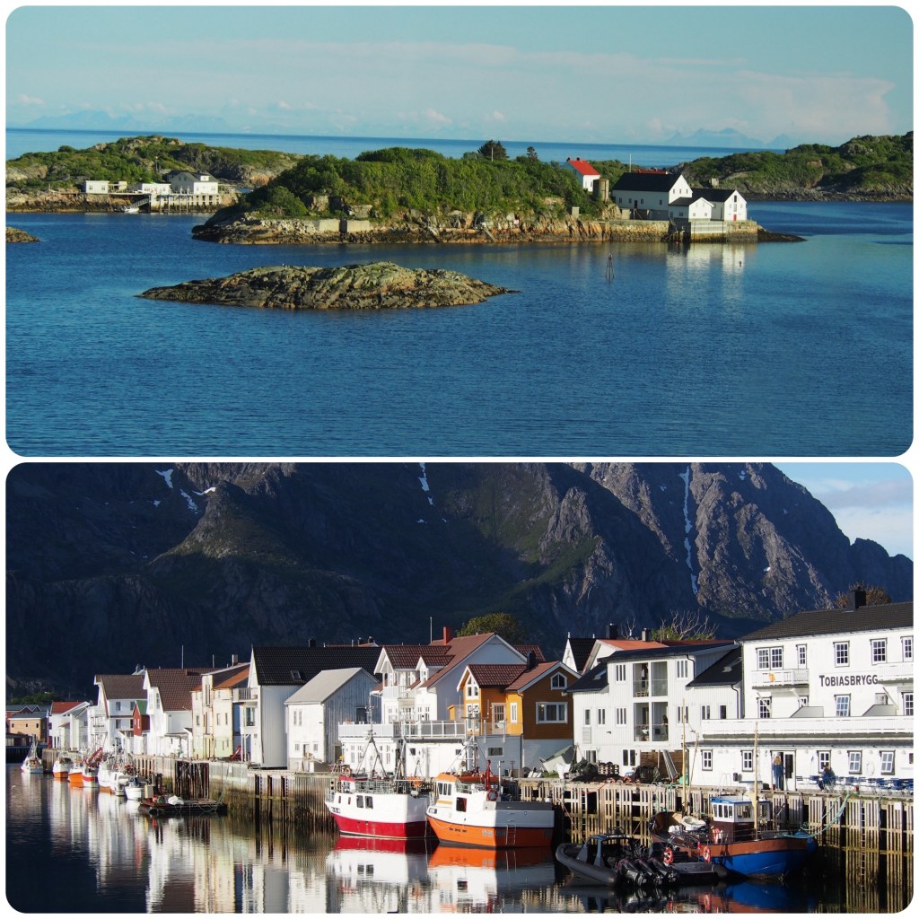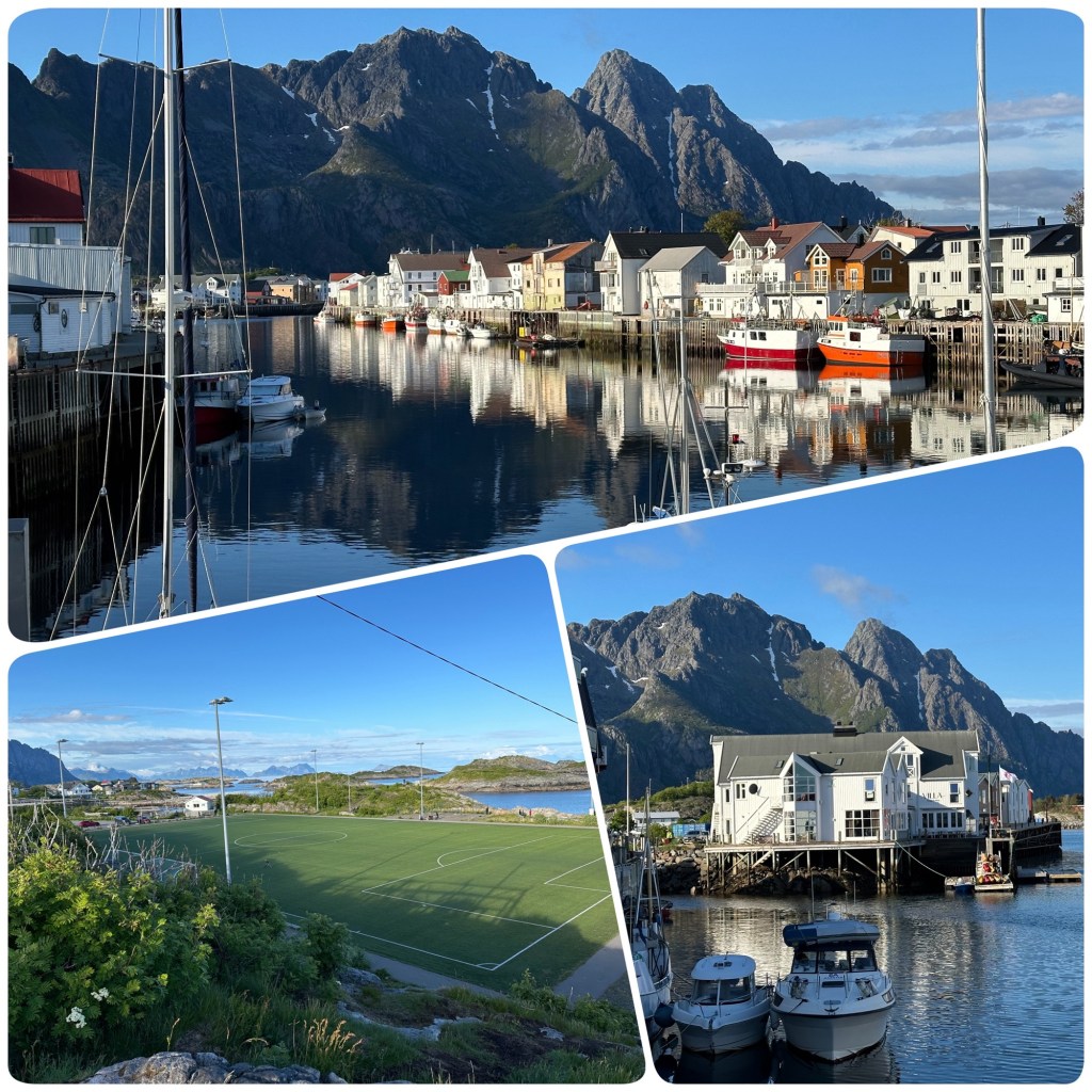 Late afternoon we join the Lofoten Islands tour. We are off to see some more beautiful and diverse scenery along the Lofoten Islands, travelling from Svolvaer to Stamsund. This area is renowned for its steep mountains and picturesque fishing villages, sandy beaches, fjords and farming areas. First stop is Henningsvaer, a quaint village with around 500 inhabitants. In the 18th century it was the most important village in Lofoten. Now the village is full of local arts and craft shops and restaurants and the Art gallery we have the choice of visiting. We opt not to and head out along the road and waterfront to the point. It’s good to stretch the legs for a decent walk. The Lofoten Islands consist of 7 islands with fjords and narrow straits between. Due to the Gulf Stream the climate is mild despite it being north of the Arctic Circle. We stop several times to view fjords and beautiful vistas before returning to the ship in Stamsund around 10 pm. Have to say having 24 hours of daylight makes evening touring quite pleasant. (P:- 24/7 tourism Has its advantages, Out of hours Window Shopping is way more economical ! Just saw the quirkiest location for a Football ground in a land starved environment).