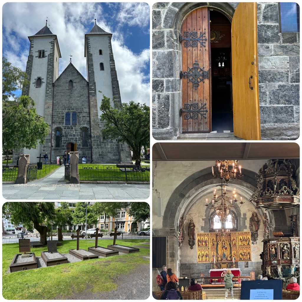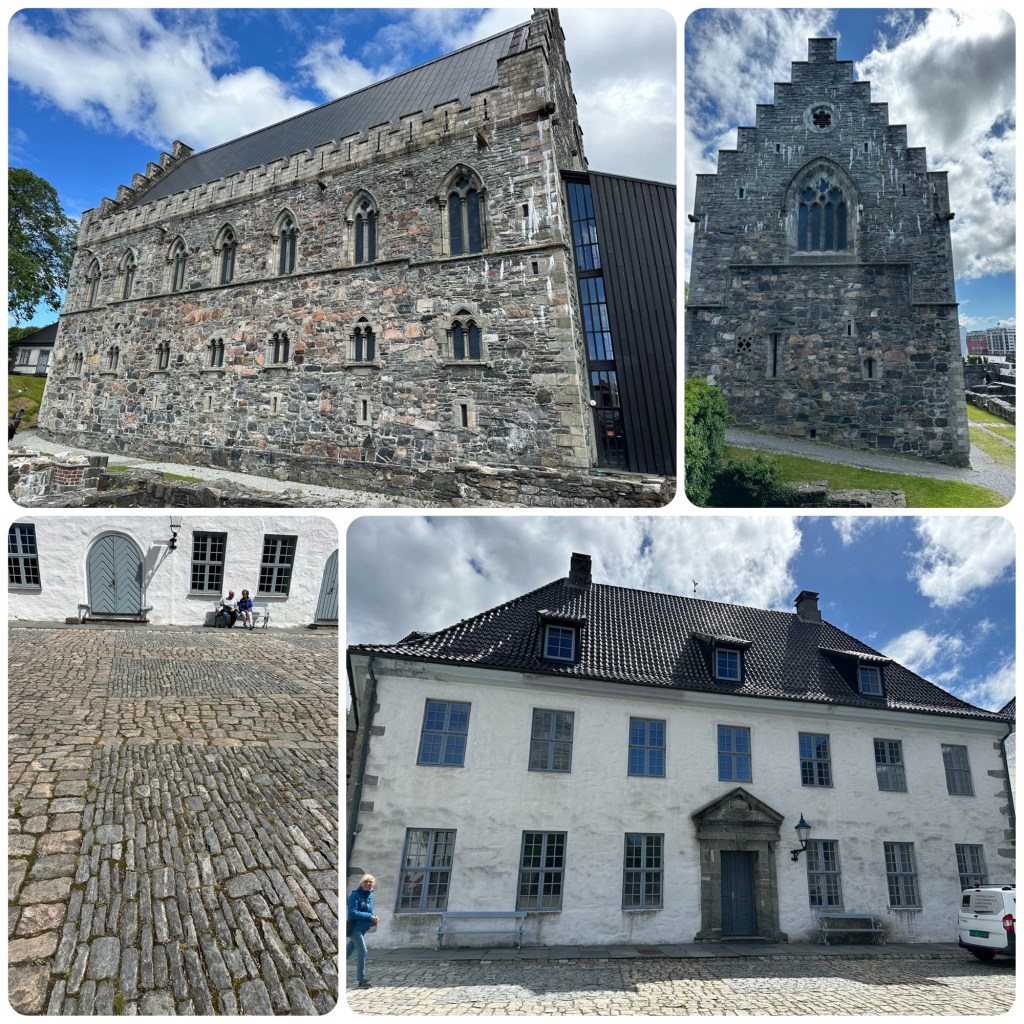 After lunch Philip wants to visit a fishing industry museum so we walk out around the base of the Bergenhus Fortress, where I leave him to go his way and I walk back through the fortress and grounds then along the warehouses, now souvenirs and handcraft stores. I stop for an icecream (P:- I missed out on Icecream)! and sit and people watch for a while. There are two cruise ships in today plus there are hundreds of young people here for part of the Bergen Fest. (Been a big concert here this morning). Just near the museum is an old church with cemetery outside. Here the graves are cast iron and sitting partially in the ground. Quite unusual. Across the road and part of the museum is the remains of St Catherine’s Hospital. Norways first hospital for women built around 1250. The building was in use until it was destroyed by fire in 1527. The ruins of the hospital were excavated in 1986 and reopened for viewing in 2003.