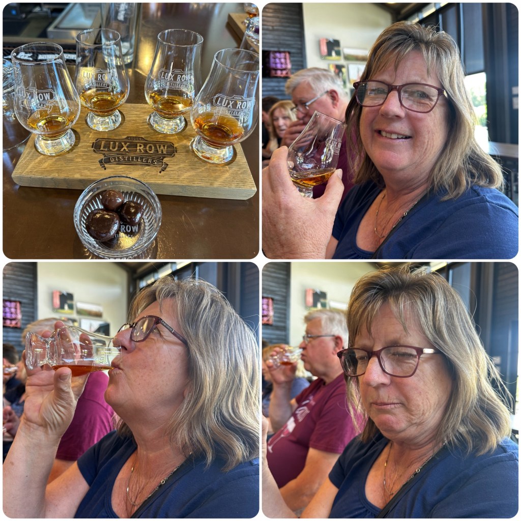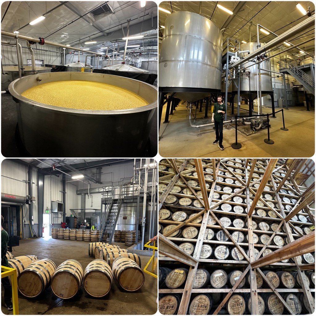 Lux Row Distillery is situated on a 90 acre property on the edge of Bardstown, Kentucky. It is a relatively new distillery, built in 2018. It has production facilities comprising over 18,000 square feet and will have 10 Barrel Rickhouses (warehouses). While the Distillery is new they have been in the Bourbon business for over 60 years. They use a custom 43 foot copper still which produces over 3 million gallons of Bourbon a year. (50,000 barrels of Bourbon a year). Tony had booked for us to do the tour which was extremely interesting, taking us from the grain being delivered, to the fermentation process, barrelling and storage and finally the tasting. (P:- Backtrack a little! The tasting started around the fermentation process of the Mash tanks (yeasty and earthy taste) then after the first distillation process (Harsh tasting 180 proof I think an alternative use would be to Launch Mr Musks rockets into space as I think that’s where my tongue ended for a few minutes! Next was a help yourself with a “pippet” direct from a 5 year aged Barrel, unfiltered c/w small charcoal sediment in the decanted liquid).