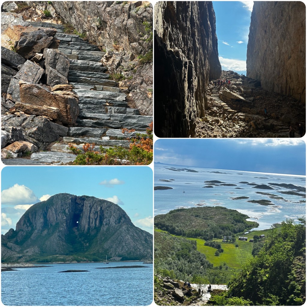 3pm we docked in Bronnoysund where we boarded a bus to Torghatten for a hike up the mountain. This is a granite dome on the island of Torget. It is known for its hole through the centre. This lovely hike up many stone steps leads us to the hole which looks deceivingly small from a distance but in fact is large enough for our ship to pass through. The 35 metre high tunnel was carved by the sea thousands of years ago or if you listen to the troll stories from the guides, it was created when the troll king threw his hat into the air to deflect an arrow fired at the Maiden of Leka by an enraged horseman who was chasing her. Just as the arrow pierced the hat, the sun rose and all were turned to stone. ( Believe it or not). Dimensions of the hole 167m long, 29-59 m high, 10-28m wide.
