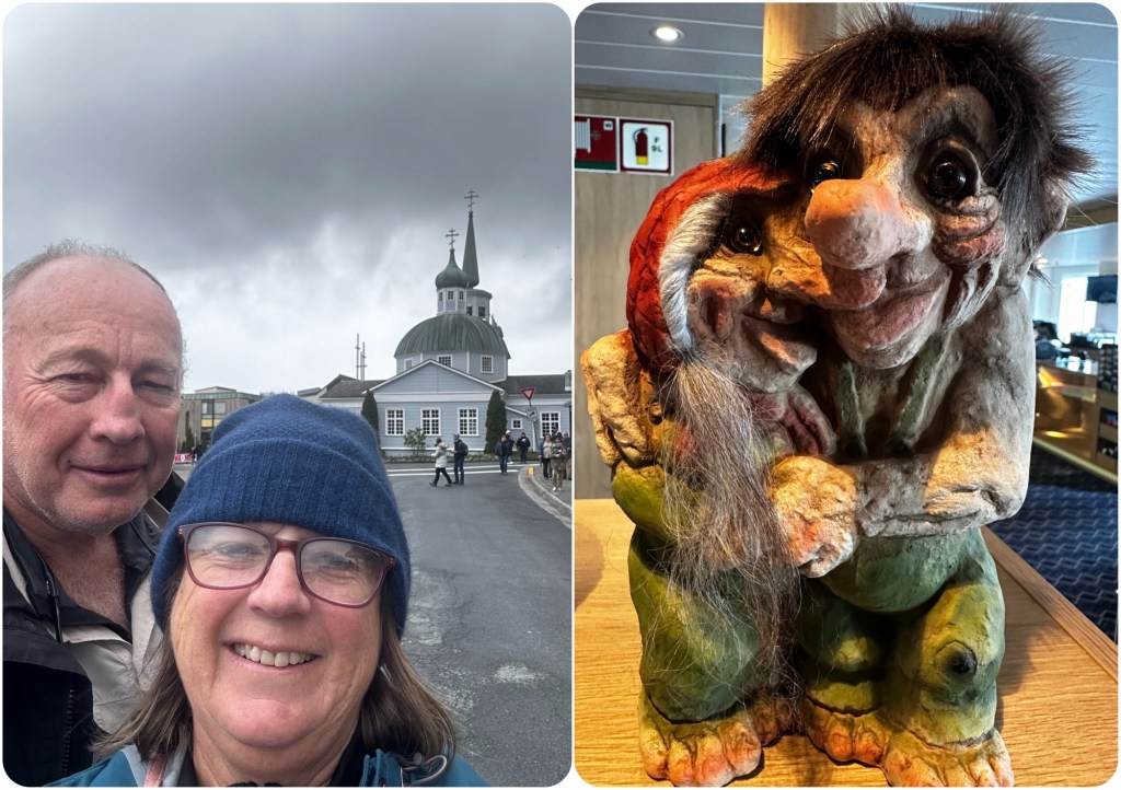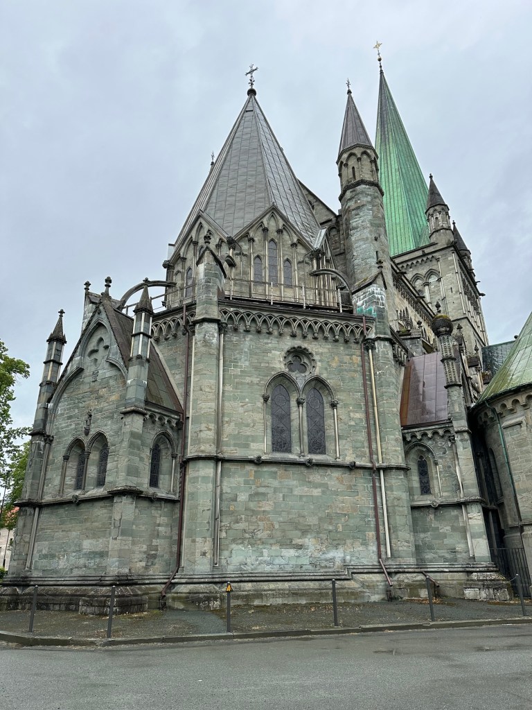 6.30am this morning we arrived in Trondheim for a 3 hour stop. To make the most of this we are up and ready to disembark as soon as the gangway is opened. Our destination is the Nidaros Cathedral. It’s drizzly with a light breeze but this doesn’t stop us. Helen is our navigator as we wander through the streets and along the river to the cathedral. It was definitely worth our walk to see this lovely building. The church is the burial site of King Olaf 11, who became the patron saint of Norway. It was built over a 230 year period from 1070 to 1300. Many additions and renovations have occurred since. In 1708 and 1719 it was destroyed by fire leaving only the stone walls. Major rebuilding and restoration began on 1869 and was officially completed in 2001. Being early morning the church isn’t open but the exterior is amazing. Next door is the Archbishops Palace, where the Archbishop lived in medieval times. This is one of the best preserved in Europe. (P:- Best not forget the Kings Stables a beautiful rustic building complete with hay loft and an old manual lift bridge over the river, both old and well restored/ preserved).