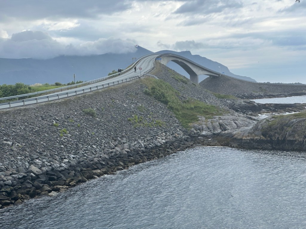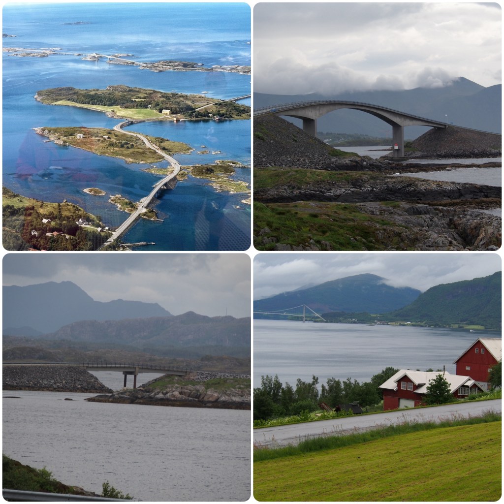 Our next stop is the Atlantic Road. This is an 8.3 kilometres road that runs through an archipelago in Hustadvika and Averoy. (P:- part of a 3 hour road trip through rich farm land, dairy farms, holiday homes dotted with marine and Granite mountain vistas). It is built on several small islands which are connected with causeways, viaducts and bridges, the most prominent being the Storseisudet bridge A great piece of engineering.