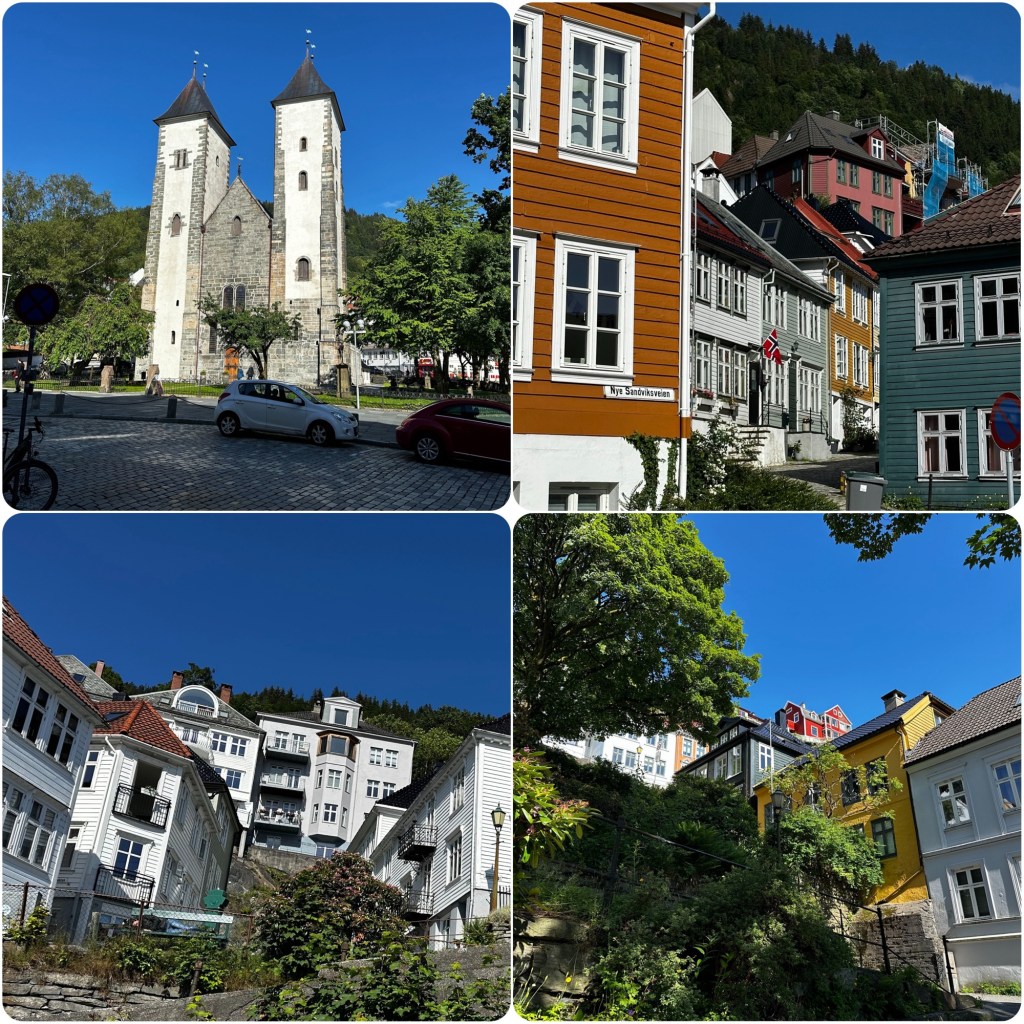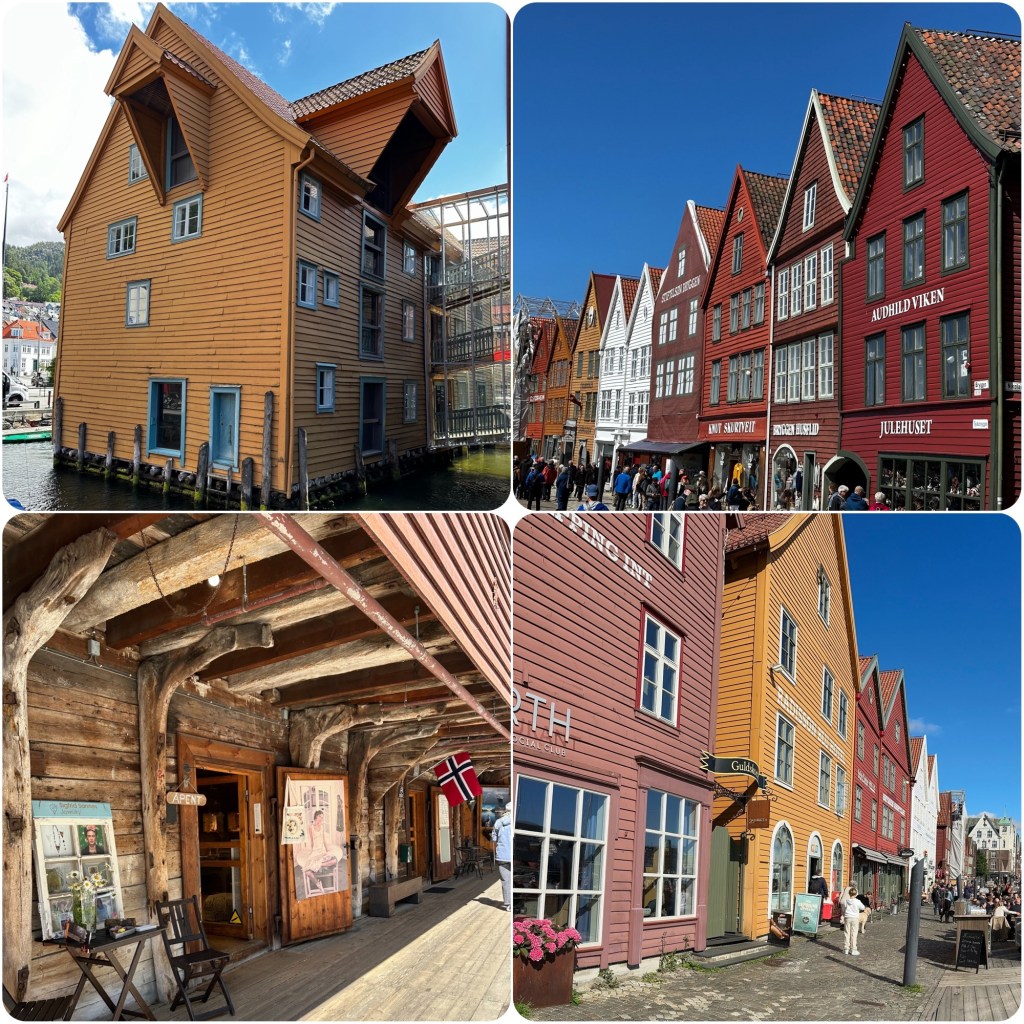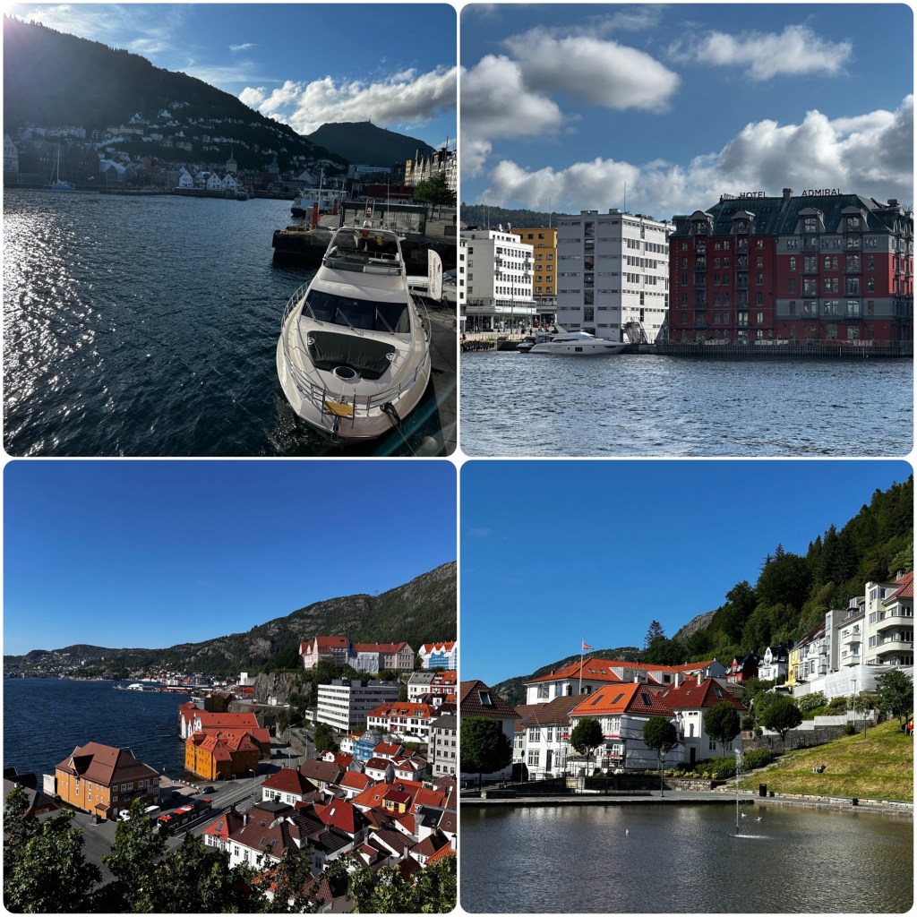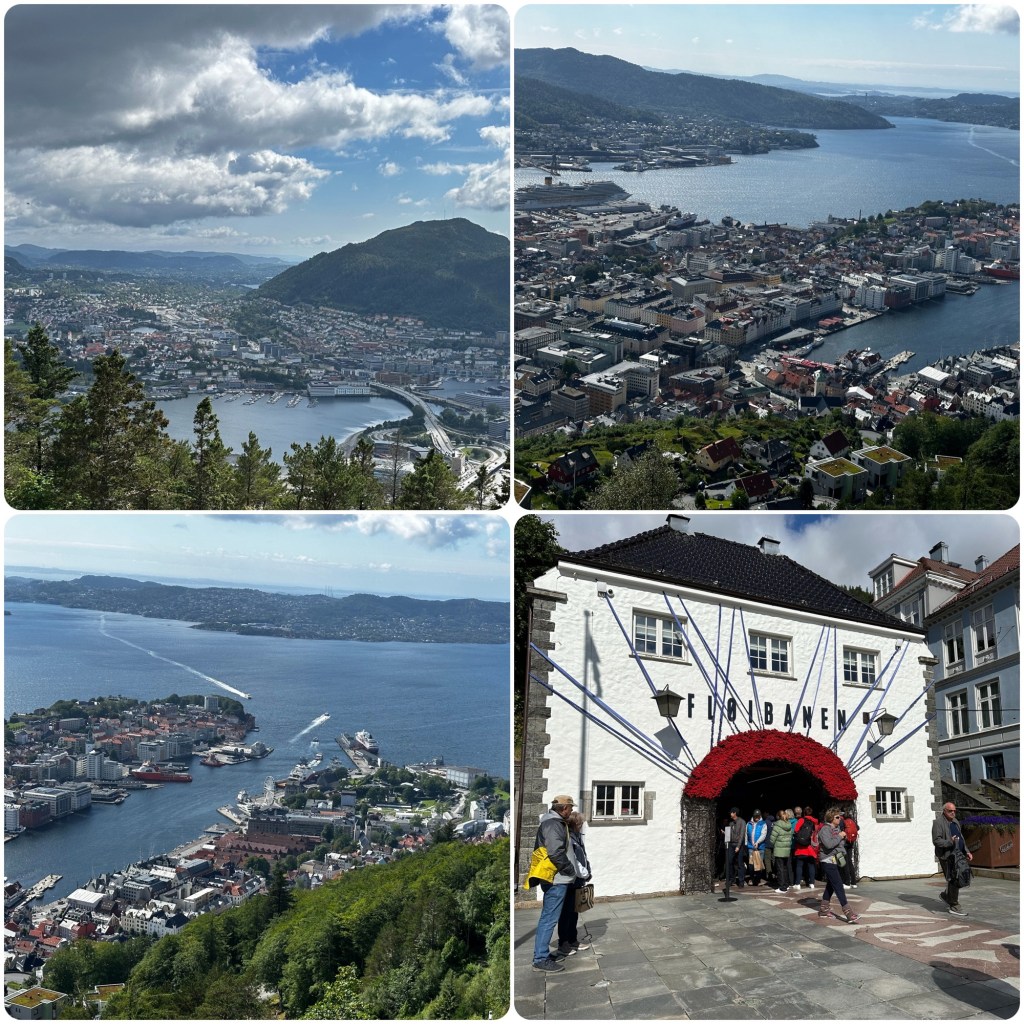 After arriving into Bergen yesterday afternoon, we transferred to the Clarion Admiral Hotel in the city centre. Then a walk to orient ourselves. (P:- Priorities I walked out onto the balcony to an up close view of Ferries and boats on Bergen Harbour – a perfect start)! We decided to take the funicular railway up to the lookout as it is a gorgeous afternoon. We walked straight onto it without any wait and started the climb to the top. After photo ops at the top we just sat and enjoyed the lovely view. And did some people watching for the next 3/4 hour, soaking up the sun. Then back down to sea level and more wandering before heading to the hotel where we met up with Helen and Ian for dinner.