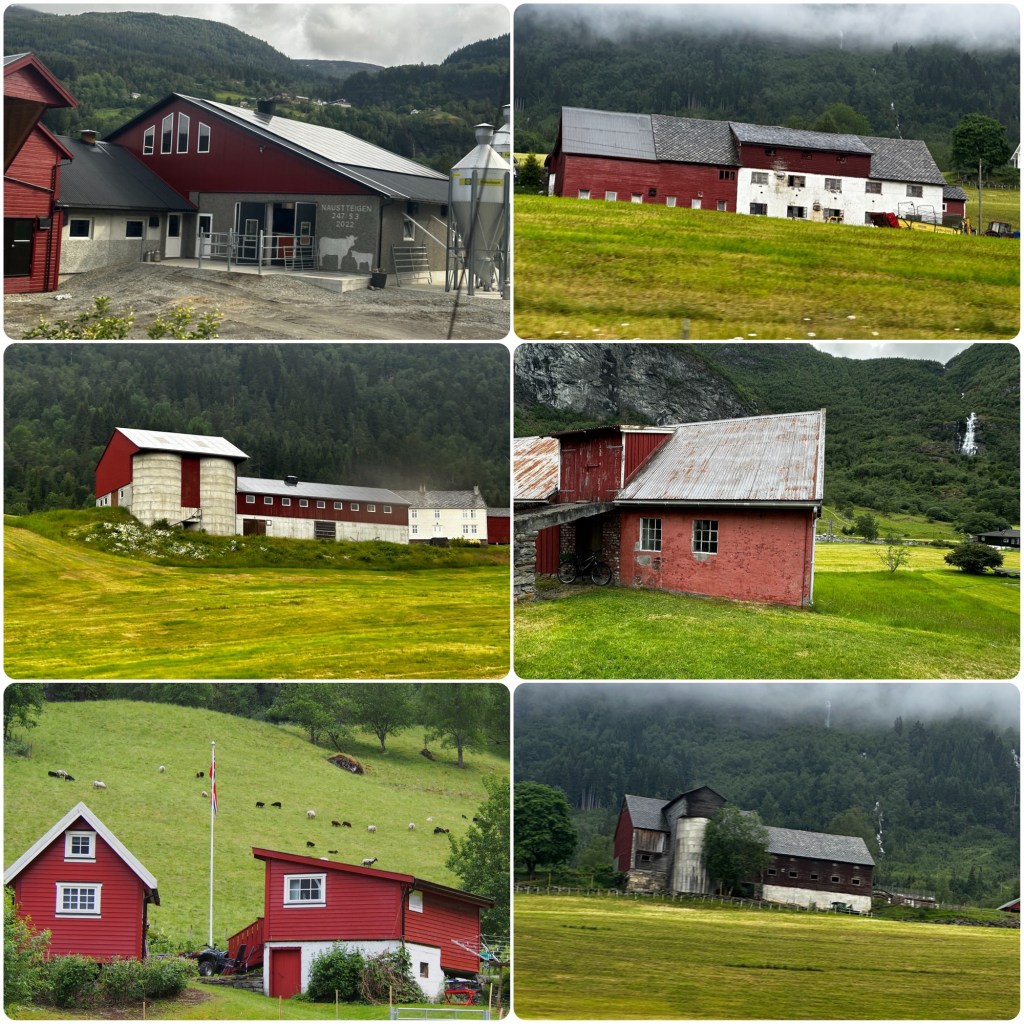Late afternoon we’re off on the Atlantic Road Tour. Departing from Kristiansund we drove through the town centre then over the first of many of todays bridges. Kristiansund is made up of four main islands. An undersea tunnel connects Kristiansund to Averoy. The tunnel is almost 6 kilometres long and the deepest part is 250 metres deep, making it one of the deepest undersea tunnels in the world. Leaving Averoy we drive through lovely countryside dotted with small farms, red painted barns and houses and spot flocks of heritage sheep and lambs. There are three main colours of houses. Ochre, red and white.