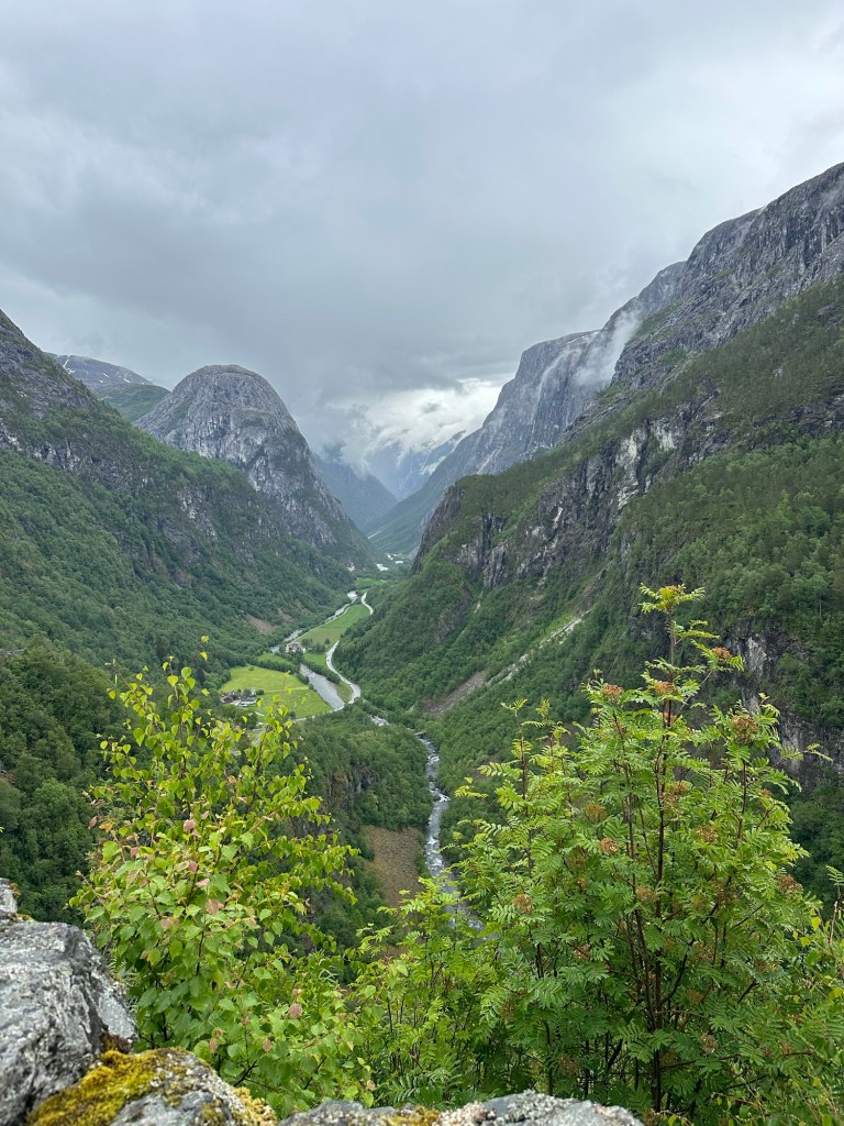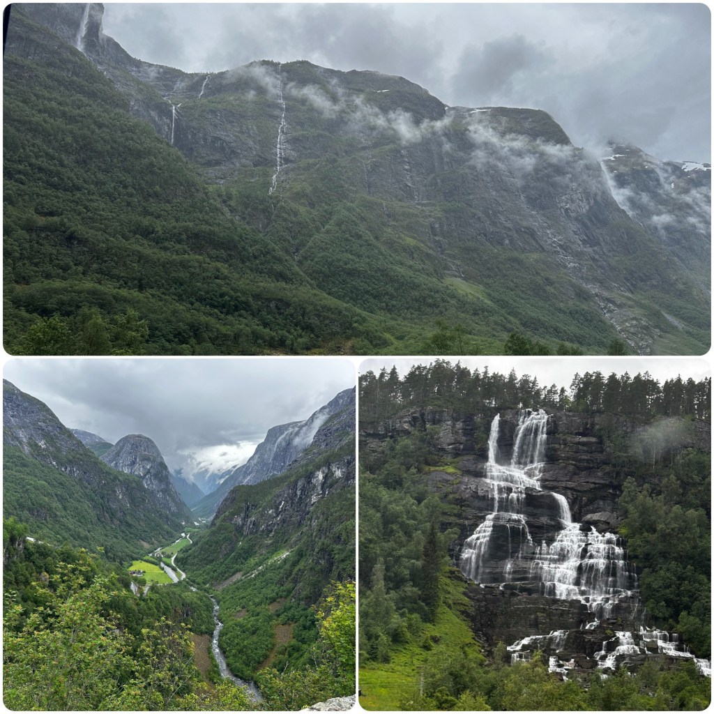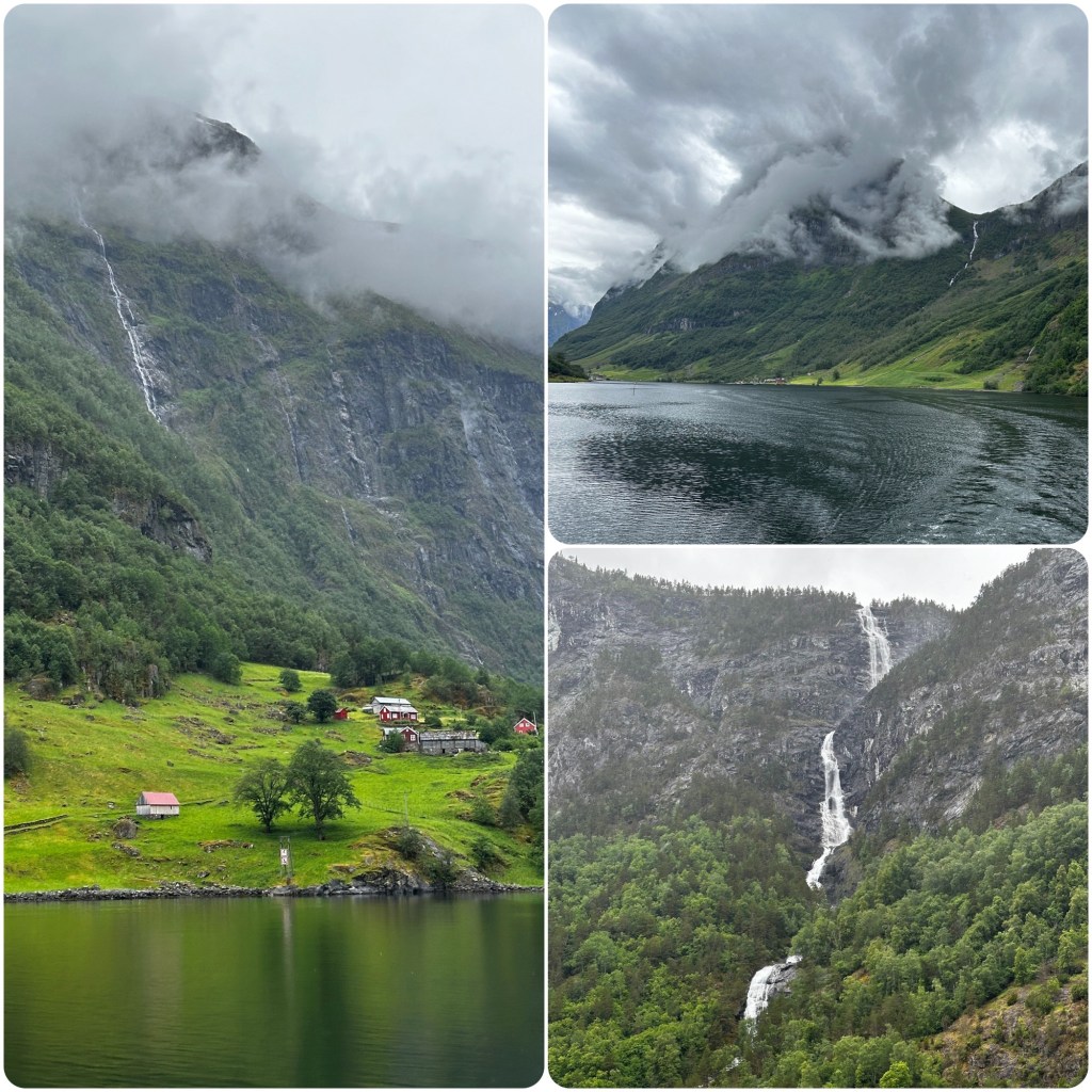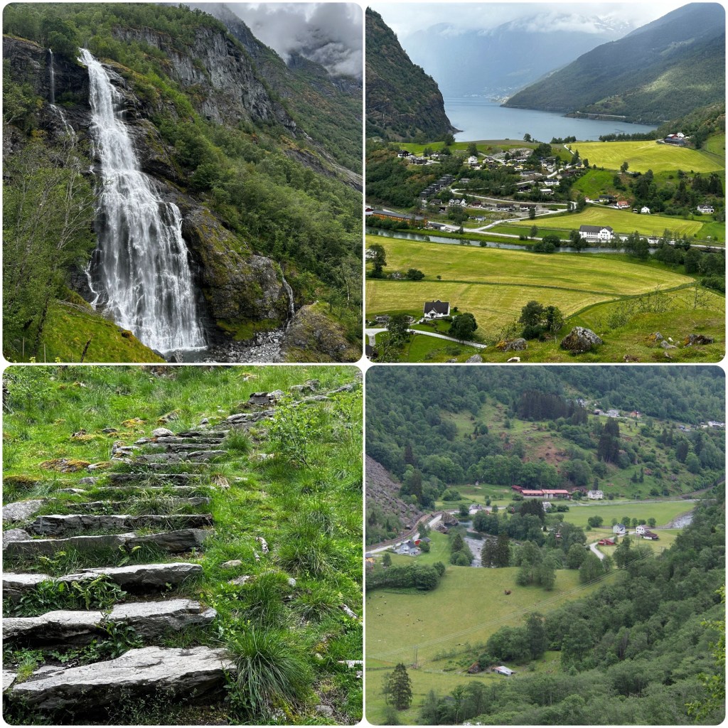 Over the next two days we are heading across Norway by train, bus, cruise and train to reach Oslo. (P:-With some scenic walks thrown in). We are just taking hand luggage as we have one night in Flam so the remainder of our luggage will be transferred to Oslo by Porter Services. Departing Bergen at 8.30am after a short brisk walk to the train station we find seats and settle in for the next hour. We are quickly out of the city and into rural areas, climbing through mountain tunnels, past waterfalls and small villages. After changing from Train to bus at Voss we stop to check the view at the Stalheim Hotel where we visit the scenic lookout over the Naeroy Valley. Absolutely stunning views over the valley below. Back on the bus and we drive on to Gudvangen where we board a cruise boat “Future of the Fiords” for the 1 1/2 hour trip down the fjord to Flam. 400 people on the boat, all wanting a seat as it’s rainy outside. Cosy!!. But it’s well worth the trip. The Naeroyfjord is one of the worlds most beautiful boat trips and is one of only two fjords in Norway on the UNESCO world heritage list due to its stunning nature. It’s gorgeous, sheer cliffs either side, multitudes of waterfalls, farms and summer farms literally hanging onto the mountainsides. We turn onto the Aurlandsfjord towards Flam where we disembark and walk up to our hotel for the night.