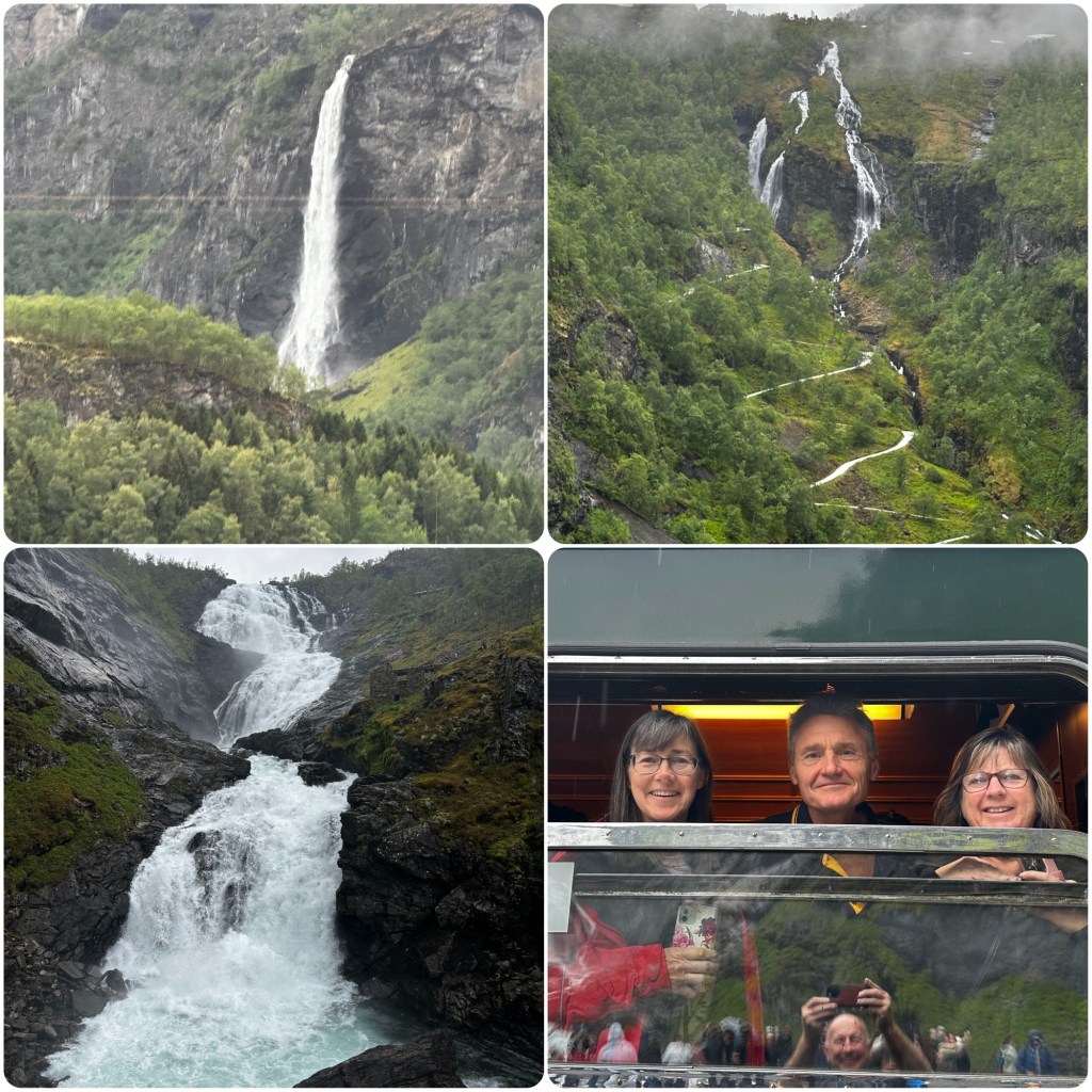 This is an incredible train journey from Flam to Myrdal, on the Bergen Railway. There is no where else in the world on this type of track with a steeper climb. The mountain line had to be laid along steep slopes and around sharp bends to enable the train to snake its way up and down the sheer inclines. Almost 80% of the railway lines have a gradient of 5.5%. The trains takes an hour to cover the 20 kilometres, through 20 tunnels, eighteen of which were excavated by hand. To avoid areas at risk of avalanche the train crosses the river and the bottom of the valley three times. Stunning scenery, ravines, river, waterfalls and mountain farms keep our eyes glued to the windows as we climb our way to Myrdal.