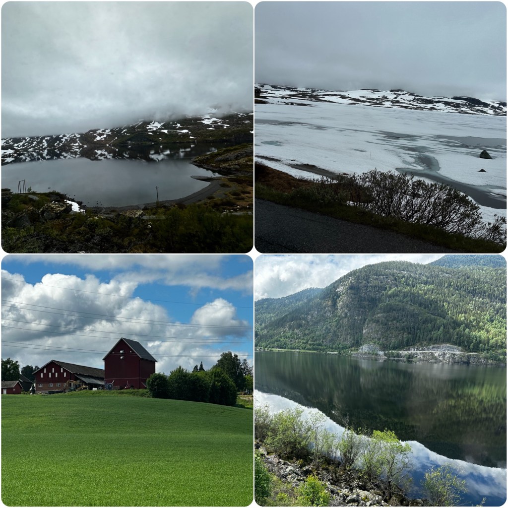 At Myrdal we change trains for the trip to Oslo. Again we pass through some stunning scenery, mountain lakes, snowy peaks, villages and as we near Oslo, agricultural land with crops of brassicas, salads, grains and hay. A short walk from Oslo station and we are at our hotel. Then a wander around the waterfront and onto the roof of the Opera House. Some interesting architecture that has ramps and steps leading to the roof giving good views over the city.