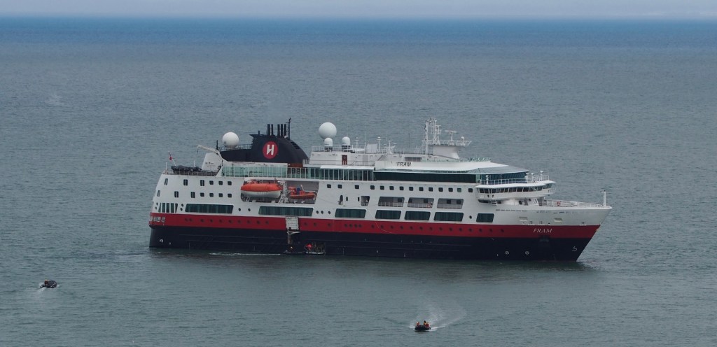 (P:-“M V Fram” is an ice strengthened ship designed for Arctic Waters. She is very comfortable, and rides like silk in calm waters and no doubt rocks around like granny’s rocking chair if it was rough! The metallic sounds of Icebergs and the rasping of Ice rubbing on her hull along with fractured Ice along side are an interesting experience).