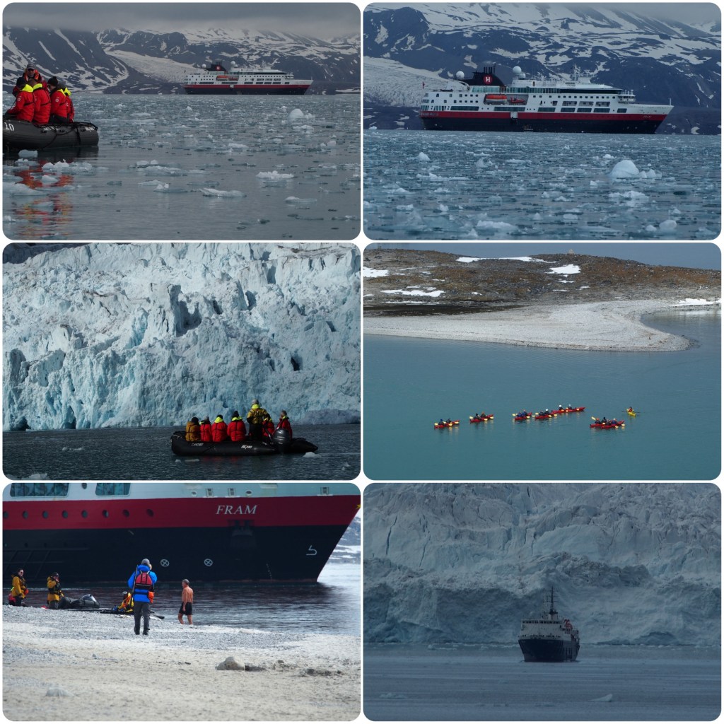 This morning we are cruising into Monacrobreen Glacier where we are off on a tender cruise around the front of the Glaciers. There are several glaciers in this bay again. Back in 2016 Monarcobreen and the one next to it were joined together. Global warming has changed this landscape drastically since then. We get to within 300 metres of the face of the glacier and the ice cliffs soar above us. Blue, white and dirty brown along the edges. As we are about to turn back to the ship a loud cracking and big ice cloud appears as a wall gives way and crashes into the sea forming a wave that radiates away from the glacier. Awesome and exciting and then another one on the other side. What an overload of excitement. Tick 3 off bucket list.