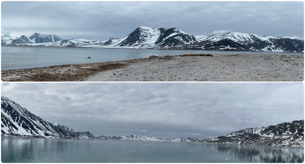 Todays first stop is at Chermsideoya for a walk along the beach and up the hill. There is “graffiti” here from many years ago. Left by Russian explorers and Nazi explorers who left a swastika marked with stones. The weather here is beautiful again. Water temperature is -1, air temperature is 2 degrees. Polar plunge is open again today and Ian is up for it again. He played walrus on an iceberg very quickly. A few more takers this morning for the swim. This landing site is in a very protected bay with mountains all around. The sun is out and the views spectacular again.