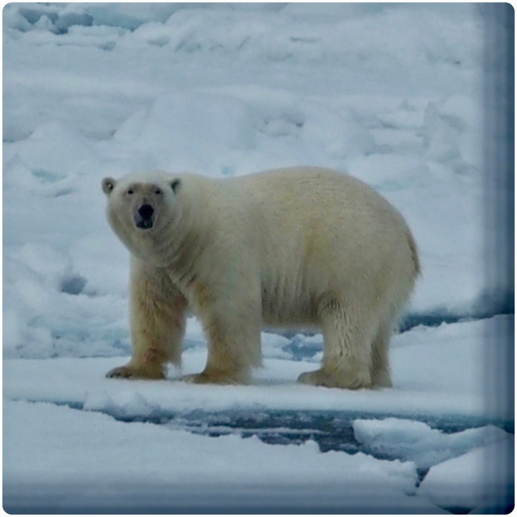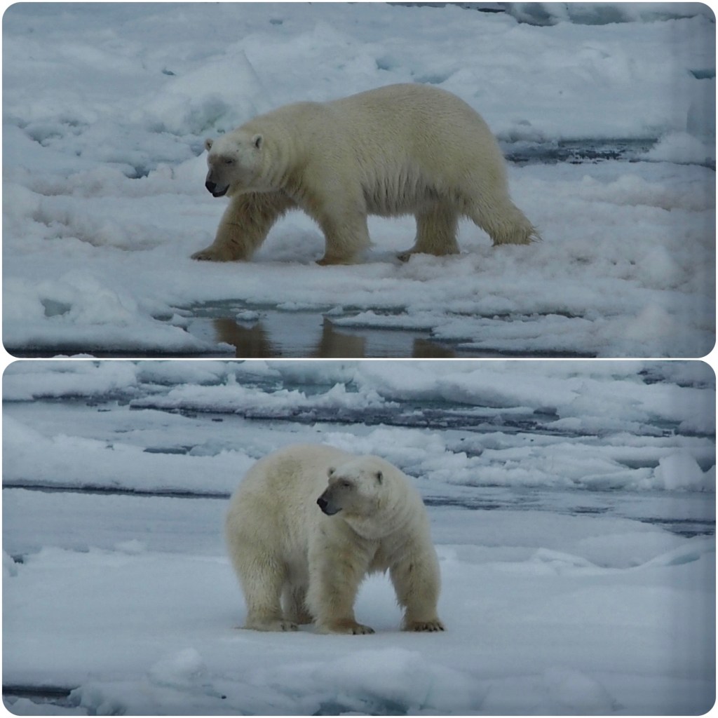 Highlight of the afternoon, a Polar Bear sighting, 2 kilometres away but we are heading towards it. Layering up with warm clothes we head out on deck and find a spot at the railing scanning with binoculars to find the polar bear, a dirty yellow/white blob on acres and acres of white ice. Finally spotting it as we get closer. Excitement is everywhere, this is our second sighting of polar bears which is unusual and to find a lone male bear on the ice pack is like finding a needle in a haystack. The next hour is spent enjoying this sighting. Maybe our last chance to see this special animal. Feeling very privileged. It takes us most of the afternoon and evening to retrace our route back through the ice to more open seas. Just as we are getting ready for bed Philip spots some walrus’s out our window. They are in the distance but clear through the binoculars. Tops off a great day.