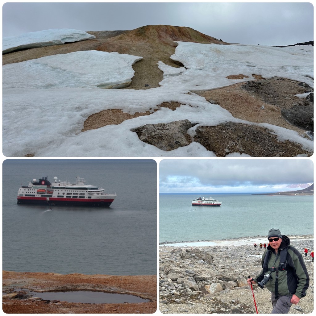 This afternoons excursion was at Jotunkjeldene. Again there are glaciers everywhere as we approach but this time we are looking at something very unexpected here in the Arctic. A hot spring. Although the water is only 20 degrees it’s hot for this area. Air temperature is just 5 degrees. We have a short climb up to view from the top of the spring and learn about the area which is on a fault line. Across the bay the cliffs are red from the iron oxide in the rock. Belugas swim in the waters around the tenders as we land and later the last group ashore spotted an Arctic Fox.