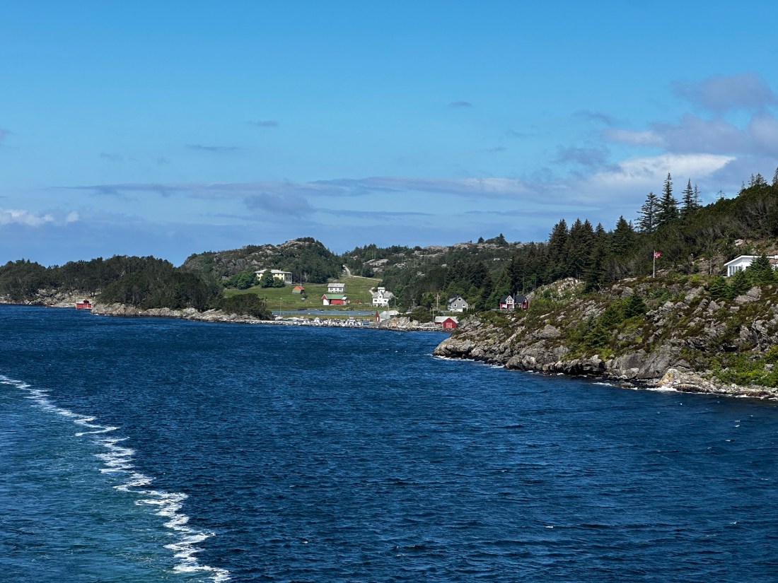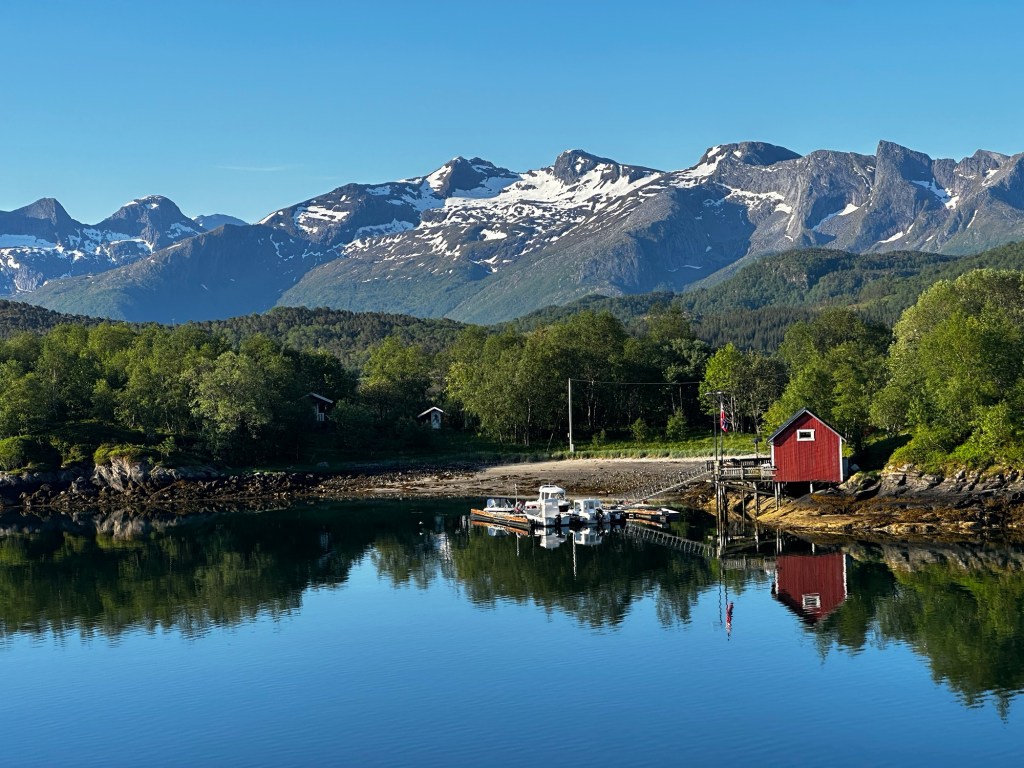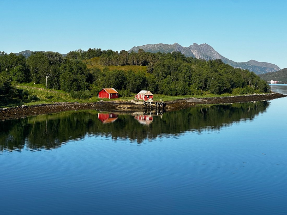We started this morning off with some very nice views as we walked around the deck in the glorious morning sunlight. (P:- One of the “We” about an hour or so earlier than the other part of the “We”). The town of Ornes was just a 10 minute stop but as we cruised along the fjord we were treated to some great reflections and stunning views. This morning the waters are flat with barely a ripple. Again small villages dot the waters edge with Ferry stops at many of them.
