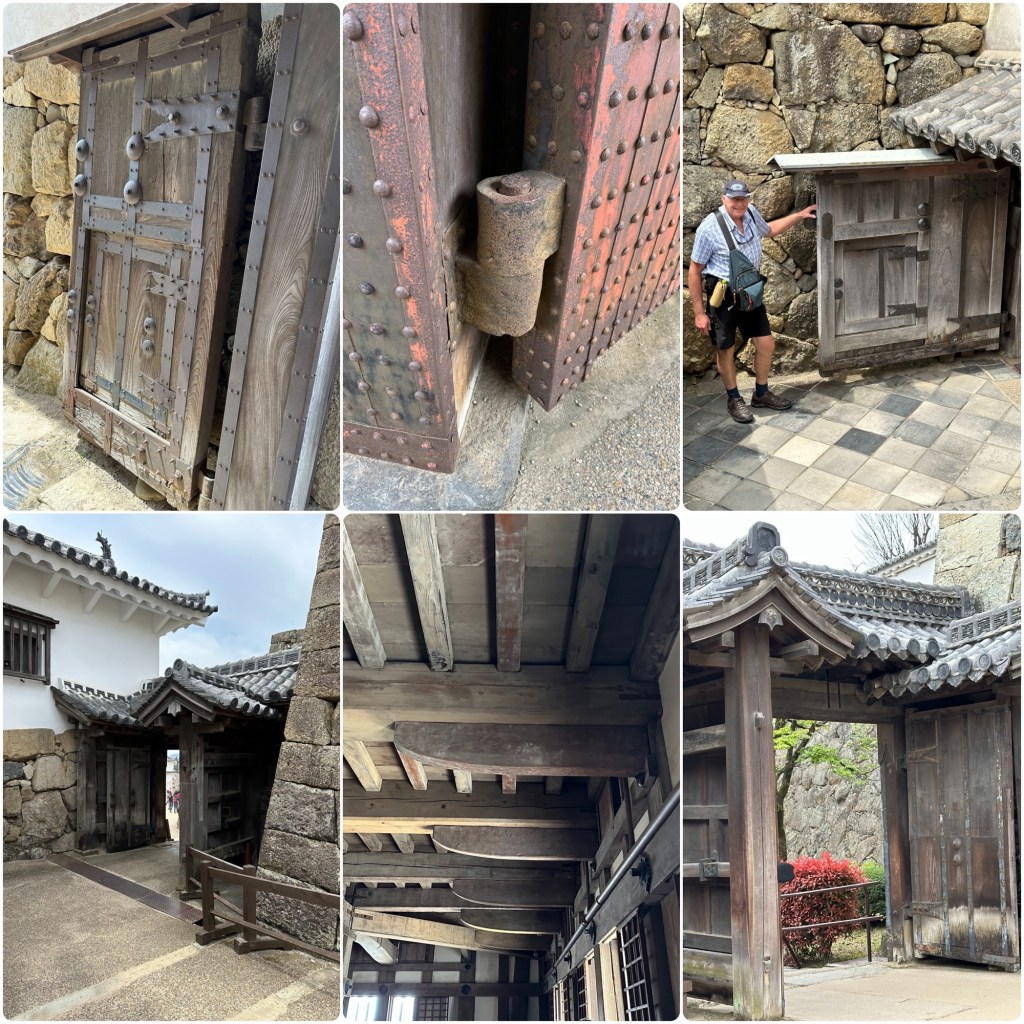 The UNESCO World Heritage Himeji Castle, also known as White Heron Castle for its soaring Keep and white plaster walls is our chosen destination today. Just over an hours drive away it is Japan’s most visited castle. The main Keep, (highest part) was built in 1601 and is one of the oldest surviving in Japan. Because the castle was never besieged, bombed or burned, more of the buildings have survived to the current day. The castle comprises a cluster of keeps, surrounded by rings of fortifications called baileys. The only stone structures are its foundations. The buildings are made mostly of wood, earth and plaster. Some of the huge doors and gateways were very impressive, with massive metal hinges and locks.