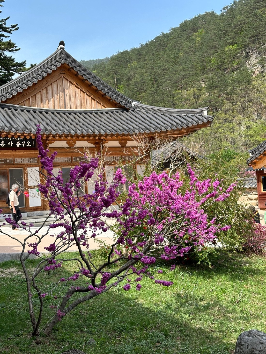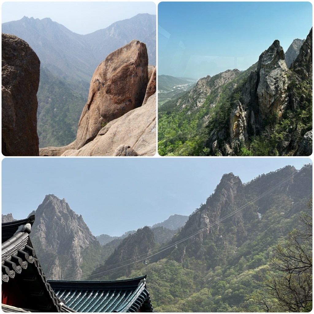 Our tour today heads us up into the mountains, which are spectacular towering above the layer of smog, to the Seoraksan National Park. The bus ride is only about 30 minutes which brings us to the Sorak Cable Car which will take us to a mountain top 700 metres above sea level. It travels 1132 metres in 5 minutes. It’s a steep ride as we climb up over a river valley to reach the terminus and then we negotiate many steps, stone, timber and tree roots, to reach the lookout point. Spectacular views from the top down to the river valley and across to the higher mountains. There is still small pockets of snow on the ground and spots of cherry blossom and wild azaleas on the slopes.