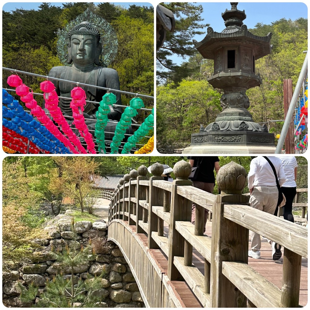 On the return trip we get some good views of the Buddhist Temple which we visit next. These buildings are so ornate compared to the Japanese Shrines we have seen. Colourfully painted, intricate carvings, colourful lanterns and prayer flags and a 50 metre high bronze Buddha dominate the area. This is the Unification Buddha and stands almost 15 metres high and weighs 108 ton.