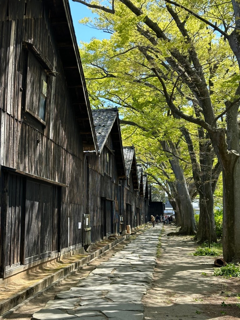 First stop is Hiyoriyama Park, checking out the Kaiko Temple and several other smaller shrines. Good views over the waterfront from here and the park is much more authentic than some of the bigger parks we’ve been to. From here we walk down the the canal and head back towards town and the Sankyo Rice Warehouses. These storehouses were constructed in 1893 and made up of 12 buildings. 9 of the 12 storehouses were still in use in 2022. A line of Zelkova trees not only provides shade from the sun but also protects the buildings from the wind. People in Sakata regard these storehouses and trees as a sign of prosperity for the city.