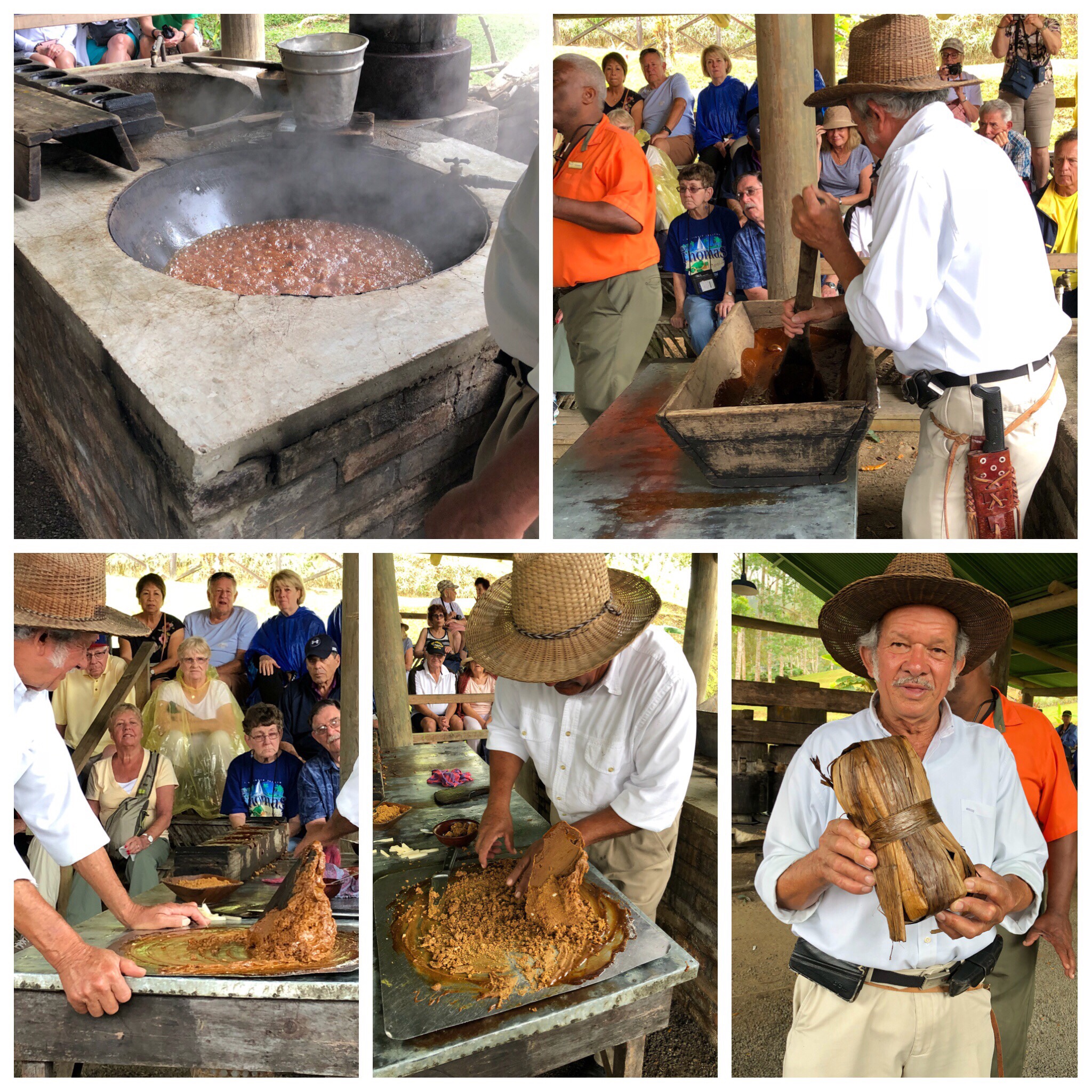 Today we are in for another long day. Tour starts at 7 am and we are heading for Hacienda Tayutic, a sugar and coffee plantation in the highlands of Costa Rica, a 2 1/2 hour bus ride away in Turrialba Hills. This tour gets us away from the coast through banana plantations, over rivers and finally winds up through the hills. We would have some great views if it wasn’t so overcast and misty. We pass many little villages and basic homes, (by basic I mean 4 walls, front door open so you see straight through, minimal furniture, no garden, dirt to the edge of the houses, washing hanging on lines under the verandahs or hanging out windows. Bars on most windows, which we thought was for safety but is a left over from colonial colonisation when they were used for safety, now most are just decorative. As we wind our way up into the hills we pass coffee trees, more banana Pseudostems ( banana plants which are actually a perennial herb), many growing wild, lush greenery and sugarcane. Now I thought sugar cane was grown on flat ground, like in Queensland and Florida, but not here, it is grown on steep ground, very steep ground, and extra steep ground. It is pretty much all harvested by hand and carted out of the paddocks by old tractors and trailers, loaded into trucks and carted to the sugar mill.