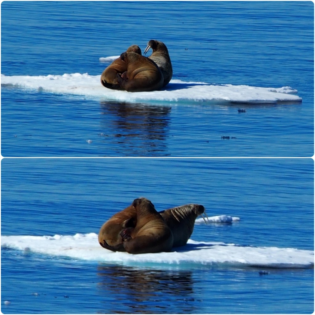 After lunch we go up to deck 7 to enjoy the views again. After enjoying the view for a while we spot some Walrus on some pack ice, just floating along. They just lounge on the ice as we pass by. Also spot another Walrus further away.
