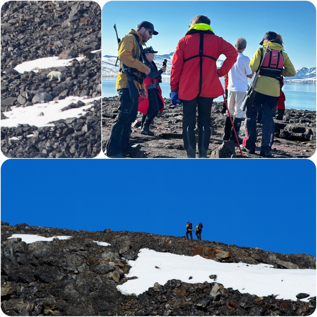Back on the ship for a short trip across the sea to another spot, Ytre Norsoya. We tender ashore again for another walk, this spot is gorgeous with areas of minute purple flowers over the ground, little streams flowing through mossy areas, auks (birds) nesting in among the craggy rocks on the cliffs above us and more great views. After the walk we head back to the ship for an afternoon, packing and relaxing. Word comes through that there is another bear sighting. So we’re out on deck trying to spot it among the rocks. Listening to fellow passengers, the last tender boat had to be evacuated from shore as the polar bear had swum 700 metres across the bay in 2-3 minutes and climbed the hillside towards the passengers and crew. Several flares were set off to frighten the bear as the evacuation was happening. Everyone returning to the ship safely, although some crew had to be picked up further along the beach for their safety. Some great excitement for the last shore excursion of our trip. (P:- And here I was stuck on board and not experiencing a closer encounter of the Worlds King of the food chain).