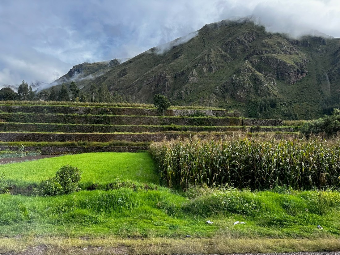 This morning our tour starts with a 7am pickup, although this turned out to be a little later as the old city area where we are, had a strike and no traffic was allowed to enter, therefore our guide had to walk several blocks to collect us and then walk back to the bus. Our tour today is taking us to The Sacred Valley. Beautiful views over Cuzco in the valley as we climb out of the city area and then down into the Sacred Valley with the Sacred River running through it. The mountainsides are steeply terraced with ancient ruins dotted along the crests of the mountains. Small farms cram along the river banks with corn, potatoes, beans and other crops. Average farms size is 2 acres.